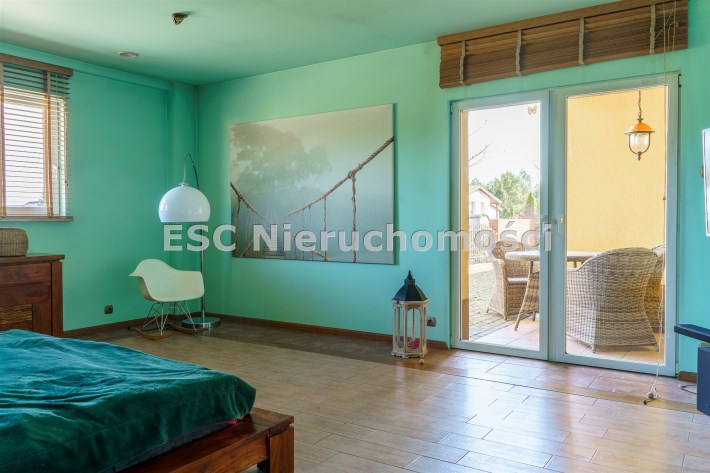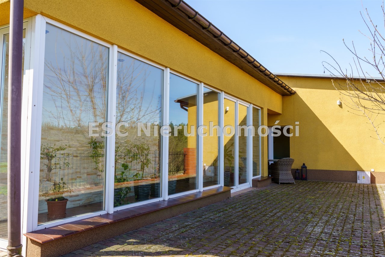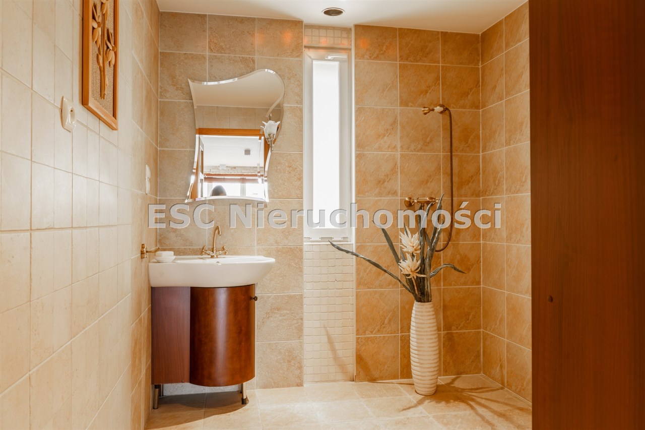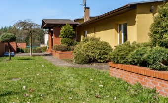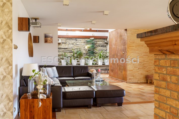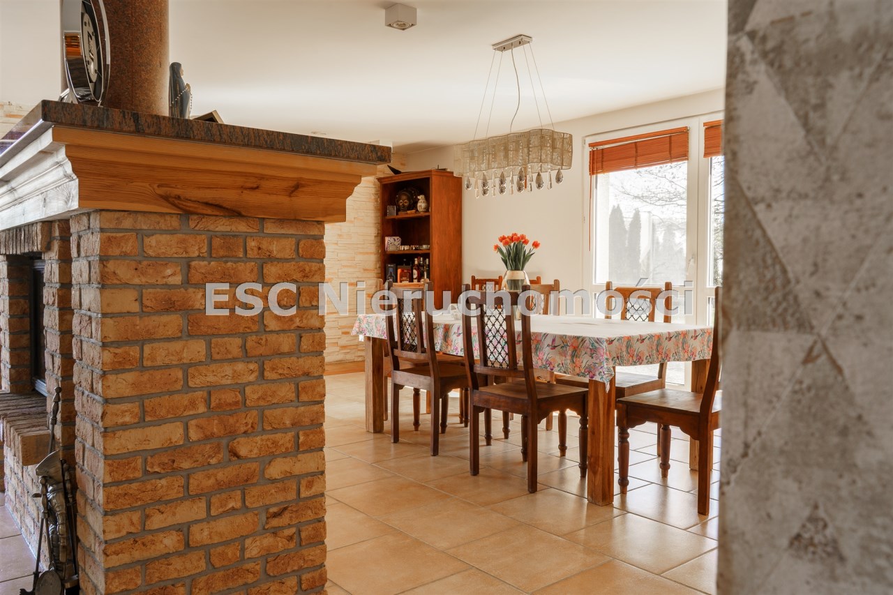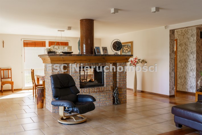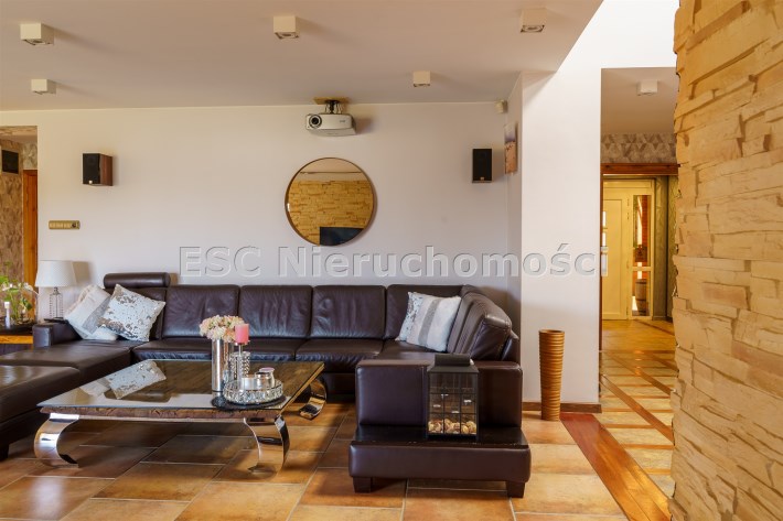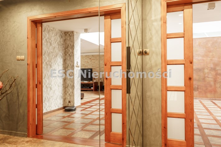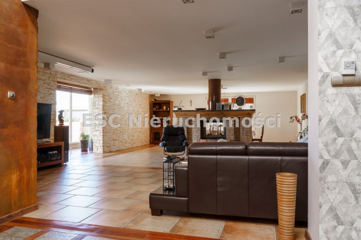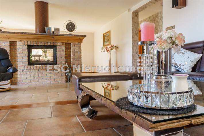 Funkcjonalny układ domu parterowego zapewnia dużą przestrzeń oraz funkcjonalne wykorzystanie całej powierzchni domu. W domu znajduje się bardzo przestronny salon o powierzchni 73 m2, z dwustronnym kominkiem, wyjściem na piękny ogród oraz ogród zimowy o powierzchni 13 m2. Wyjście na ogród zimowy zamykany funkcjonalna roletą bambusową sterowaną na pilota. W salonie znajduje się projektor kinowy z ekranem 3m na 2m, który pozostaje w cenie nieruchomości. Kuchnia bardzo ustawna, jasna i przestronna. W kuchni znajduję się nowoczesna zabudowa kuchenna, która wraz ze sprzętem takim jak: zmywarka, piekarnik elektryczny, płyta indukcyjna, okap, lodówka, ekspres do kawy oraz ciepła szuflada pozostaje w cenie nieruchomości. Wszystkie urządzenia wysokiej klasy firmy Siemens. W kuchnia znajduje się zintegrowany z meblami kuchennymi blat z krzesłami. Dodatkowym atutem na pewno jest spiżarnia, która znajduje się za kuchnią. Na wejściu do domu znajduje się przedpokój o powierzchni ok. 13 m2 zabudowany szafami typu Komandor. Pozostałe pomieszczenia w domu to gabinet o pow. ok. 10 m2, w którym również znajduje się zabudowa mebli wraz z biurkiem do pracy, łazienka o pow. 6 m2, sypialnia o pow.26 m2 z prywatną łazienką o pow. 6,50 m2., 2 pokoje z garderobami o powierzchniach ok. 17 m2 i 20 m2. łazienka przy pokojach o pow. 10m2 z wanną oraz kabiną prysznicową, pomieszczenie gospodarcze o pow. ok. 7,50 m2.W bryle budynku znajduje się podwójny garaż o pow. 57 m2. W korytarzu, który prowadzi do części sypialnianej znajduje się bardzo efektowna ściana z piaskowca ze ściennym wodospadem, który latem powoduje znakomity mikroklimat.