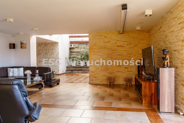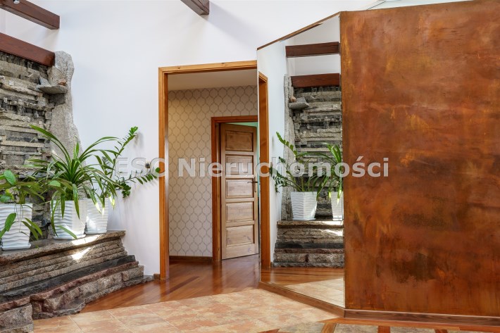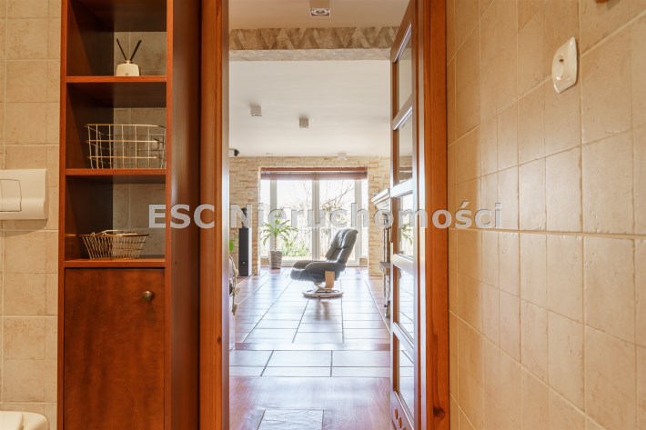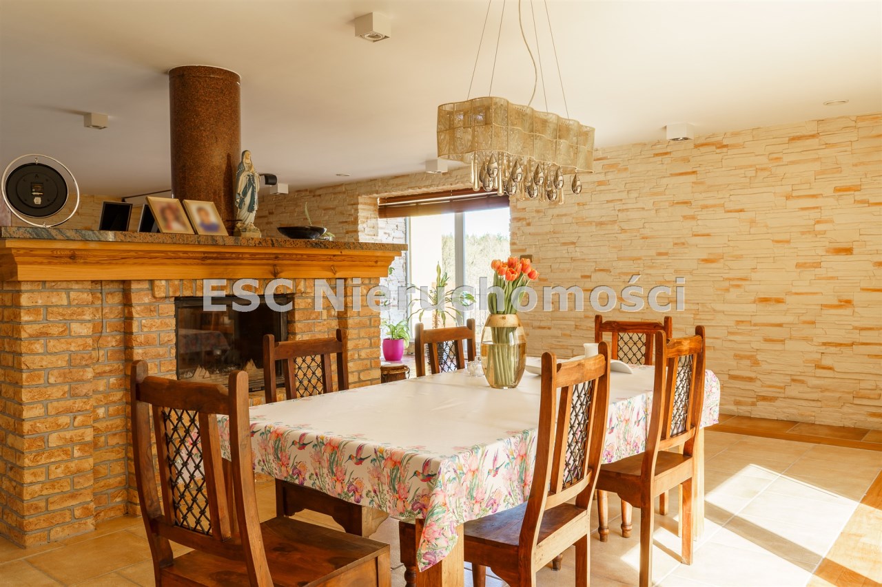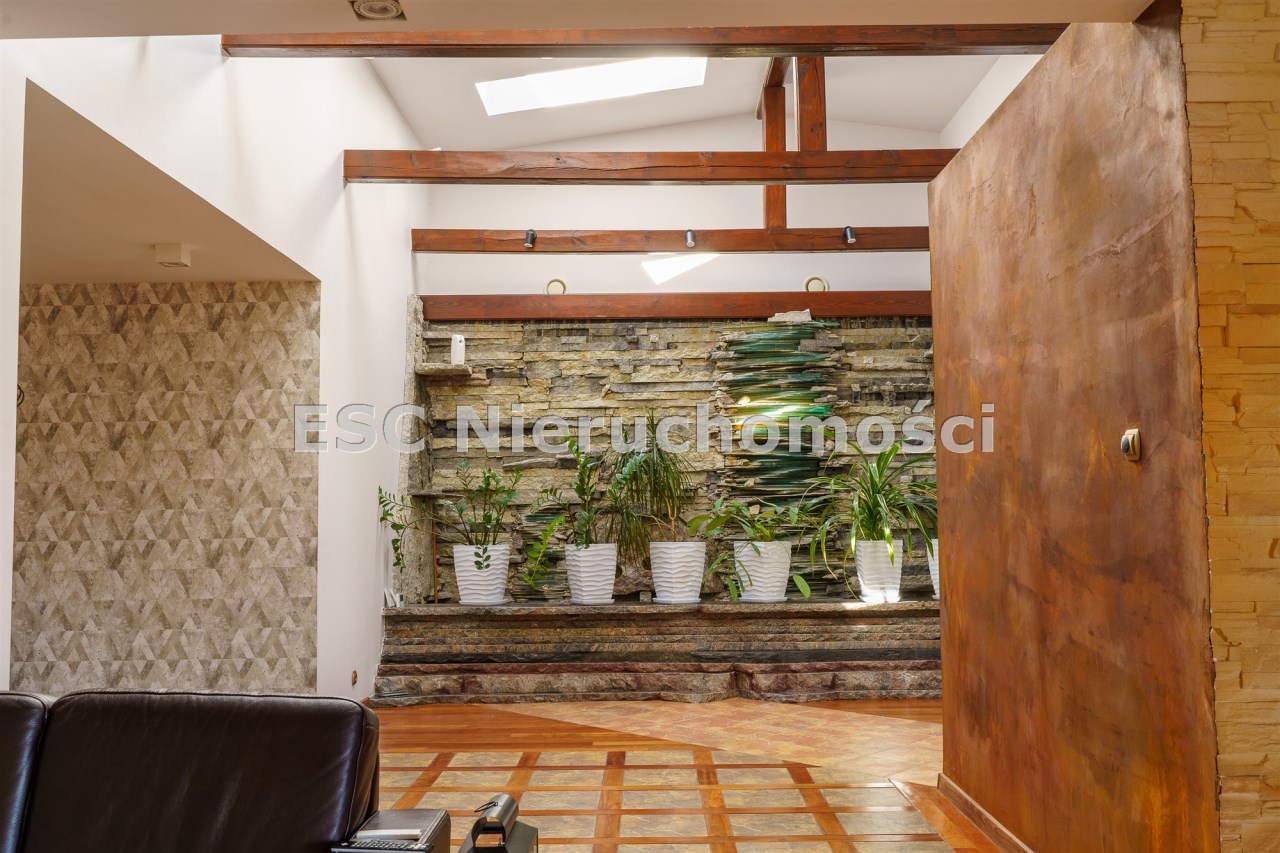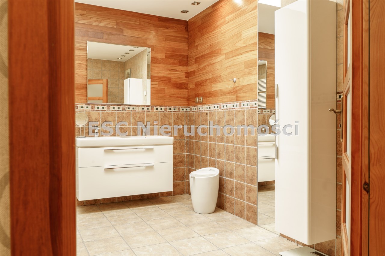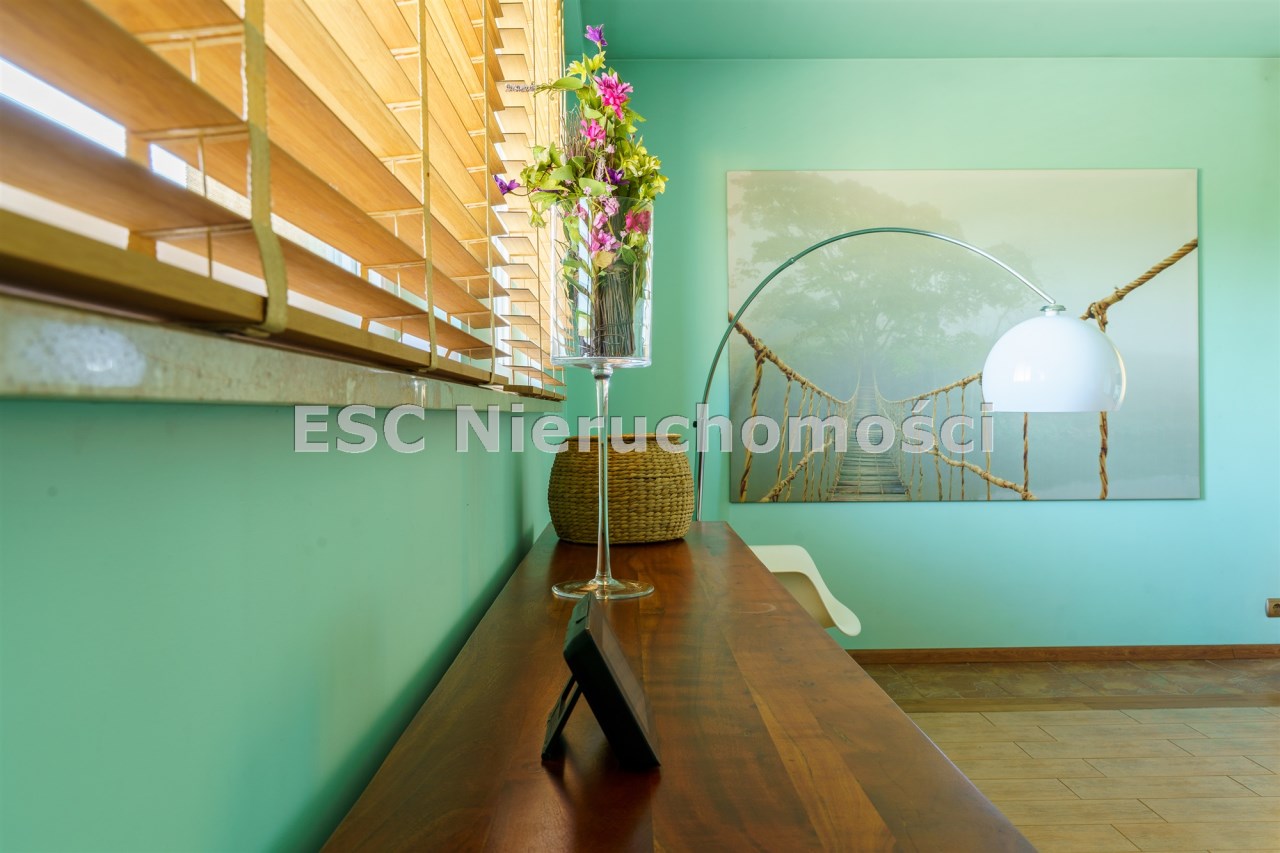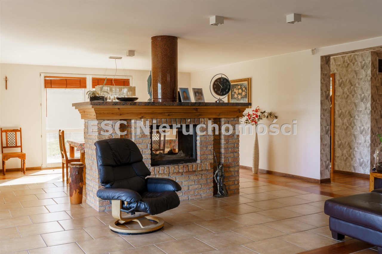 Funkcjonalny układ domu parterowego zapewnia dużą przestrzeń oraz funkcjonalne wykorzystanie całej powierzchni domu. W domu znajduje się bardzo przestronny salon o powierzchni 73 m2, z dwustronnym kominkiem, wyjściem na piękny ogród oraz ogród zimowy o powierzchni 13 m2. Wyjście na ogród zimowy zamykany funkcjonalna roletą bambusową sterowaną na pilota. W salonie znajduje się projektor kinowy z ekranem 3m na 2m, który pozostaje w cenie nieruchomości. Kuchnia bardzo ustawna, jasna i przestronna. W kuchni znajduję się nowoczesna zabudowa kuchenna, która wraz ze sprzętem takim jak: zmywarka, piekarnik elektryczny, płyta indukcyjna, okap, lodówka, ekspres do kawy oraz ciepła szuflada pozostaje w cenie nieruchomości. Wszystkie urządzenia wysokiej klasy firmy Siemens. W kuchnia znajduje się zintegrowany z meblami kuchennymi blat z krzesłami. Dodatkowym atutem na pewno jest spiżarnia, która znajduje się za kuchnią. Na wejściu do domu znajduje się przedpokój o powierzchni ok. 13 m2 zabudowany szafami typu Komandor. Pozostałe pomieszczenia w domu to gabinet o pow. ok. 10 m2, w którym również znajduje się zabudowa mebli wraz z biurkiem do pracy, łazienka o pow. 6 m2, sypialnia o pow.26 m2 z prywatną łazienką o pow. 6,50 m2., 2 pokoje z garderobami o powierzchniach ok. 17 m2 i 20 m2. łazienka przy pokojach o pow. 10m2 z wanną oraz kabiną prysznicową, pomieszczenie gospodarcze o pow. ok. 7,50 m2.W bryle budynku znajduje się podwójny garaż o pow. 57 m2. W korytarzu, który prowadzi do części sypialnianej znajduje się bardzo efektowna ściana z piaskowca ze ściennym wodospadem, który latem powoduje znakomity mikroklimat.