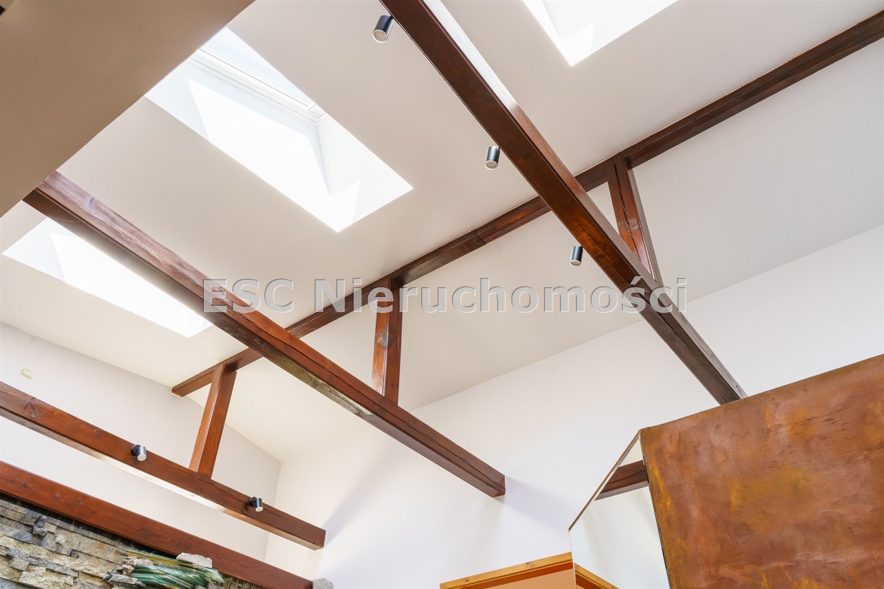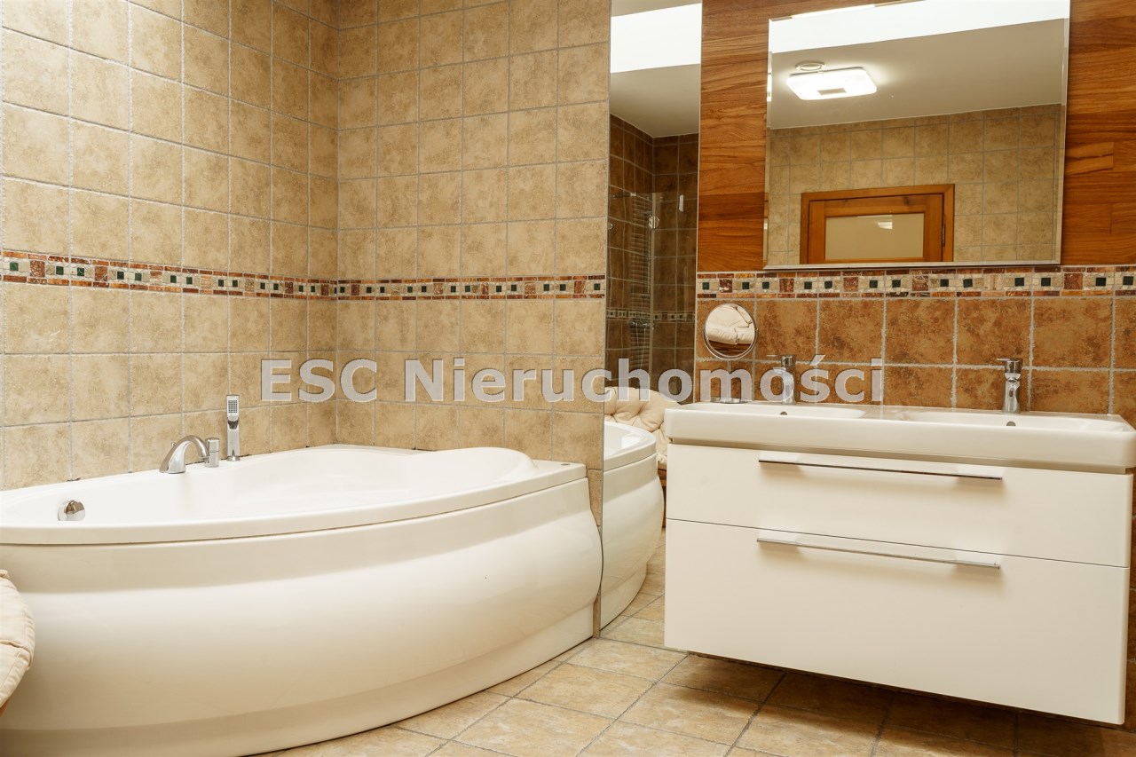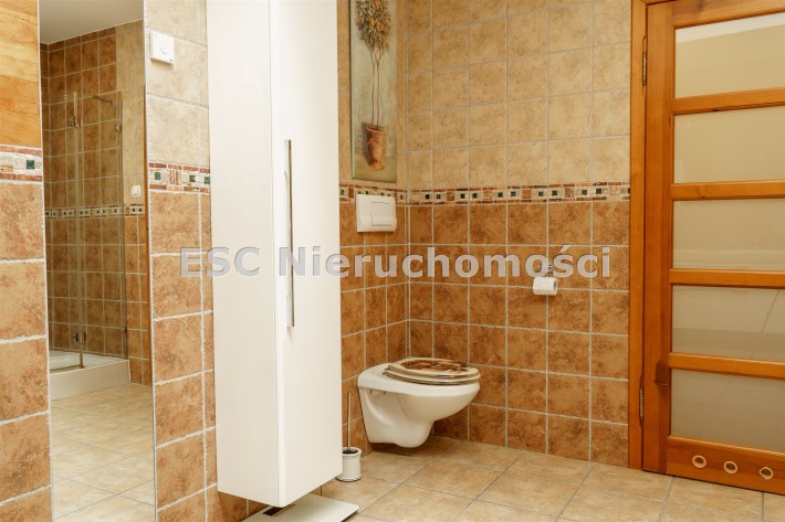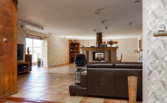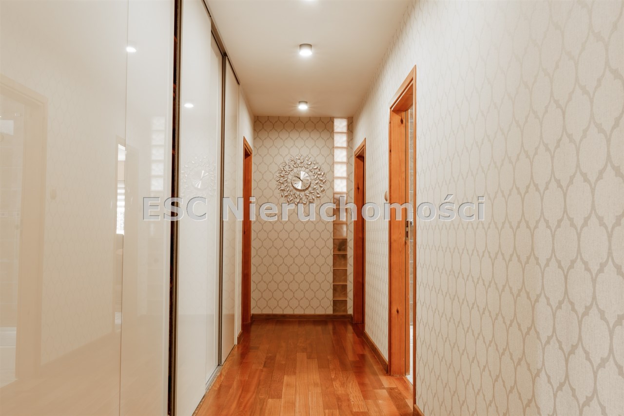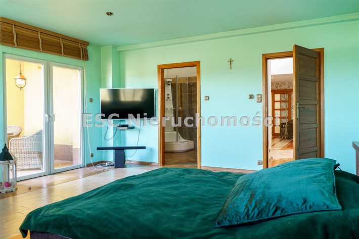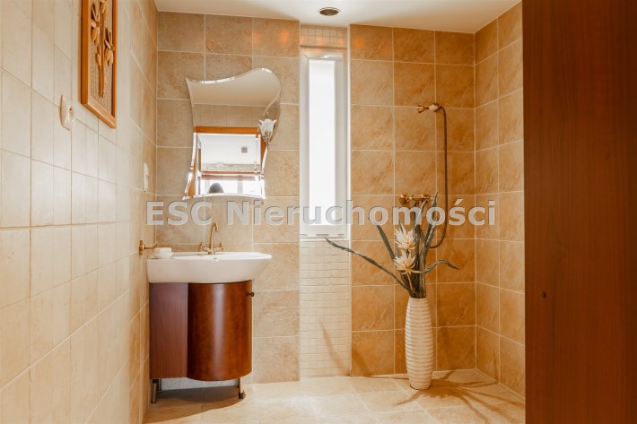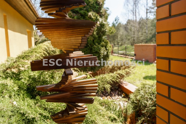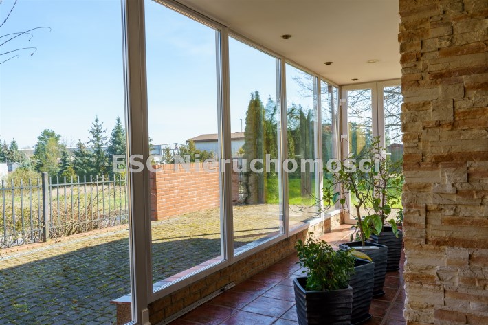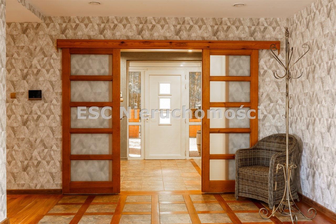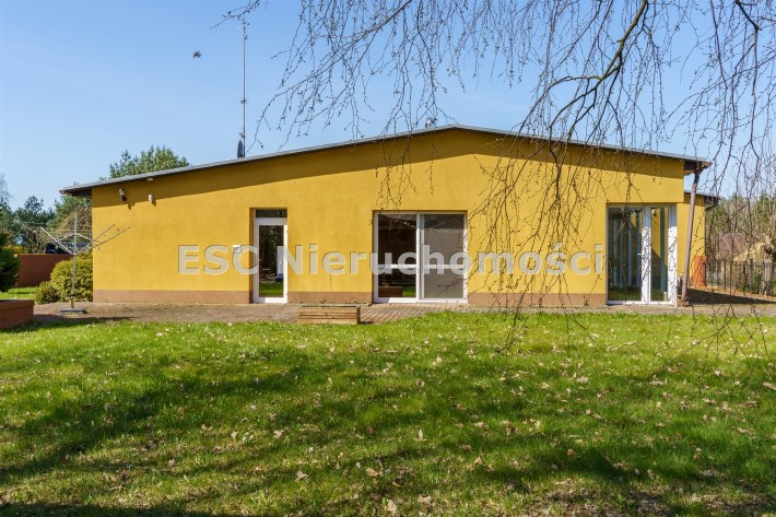 Funkcjonalny układ domu parterowego zapewnia dużą przestrzeń oraz funkcjonalne wykorzystanie całej powierzchni domu. W domu znajduje się bardzo przestronny salon o powierzchni 73 m2, z dwustronnym kominkiem, wyjściem na piękny ogród oraz ogród zimowy o powierzchni 13 m2. Wyjście na ogród zimowy zamykany funkcjonalna roletą bambusową sterowaną na pilota. W salonie znajduje się projektor kinowy z ekranem 3m na 2m, który pozostaje w cenie nieruchomości. Kuchnia bardzo ustawna, jasna i przestronna. W kuchni znajduję się nowoczesna zabudowa kuchenna, która wraz ze sprzętem takim jak: zmywarka, piekarnik elektryczny, płyta indukcyjna, okap, lodówka, ekspres do kawy oraz ciepła szuflada pozostaje w cenie nieruchomości. Wszystkie urządzenia wysokiej klasy firmy Siemens. W kuchnia znajduje się zintegrowany z meblami kuchennymi blat z krzesłami. Dodatkowym atutem na pewno jest spiżarnia, która znajduje się za kuchnią. Na wejściu do domu znajduje się przedpokój o powierzchni ok. 13 m2 zabudowany szafami typu Komandor. Pozostałe pomieszczenia w domu to gabinet o pow. ok. 10 m2, w którym również znajduje się zabudowa mebli wraz z biurkiem do pracy, łazienka o pow. 6 m2, sypialnia o pow.26 m2 z prywatną łazienką o pow. 6,50 m2., 2 pokoje z garderobami o powierzchniach ok. 17 m2 i 20 m2. łazienka przy pokojach o pow. 10m2 z wanną oraz kabiną prysznicową, pomieszczenie gospodarcze o pow. ok. 7,50 m2.W bryle budynku znajduje się podwójny garaż o pow. 57 m2. W korytarzu, który prowadzi do części sypialnianej znajduje się bardzo efektowna ściana z piaskowca ze ściennym wodospadem, który latem powoduje znakomity mikroklimat.