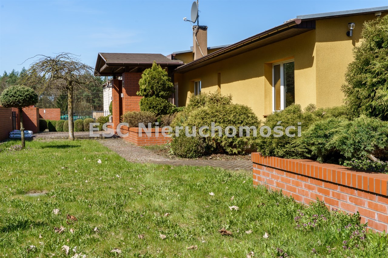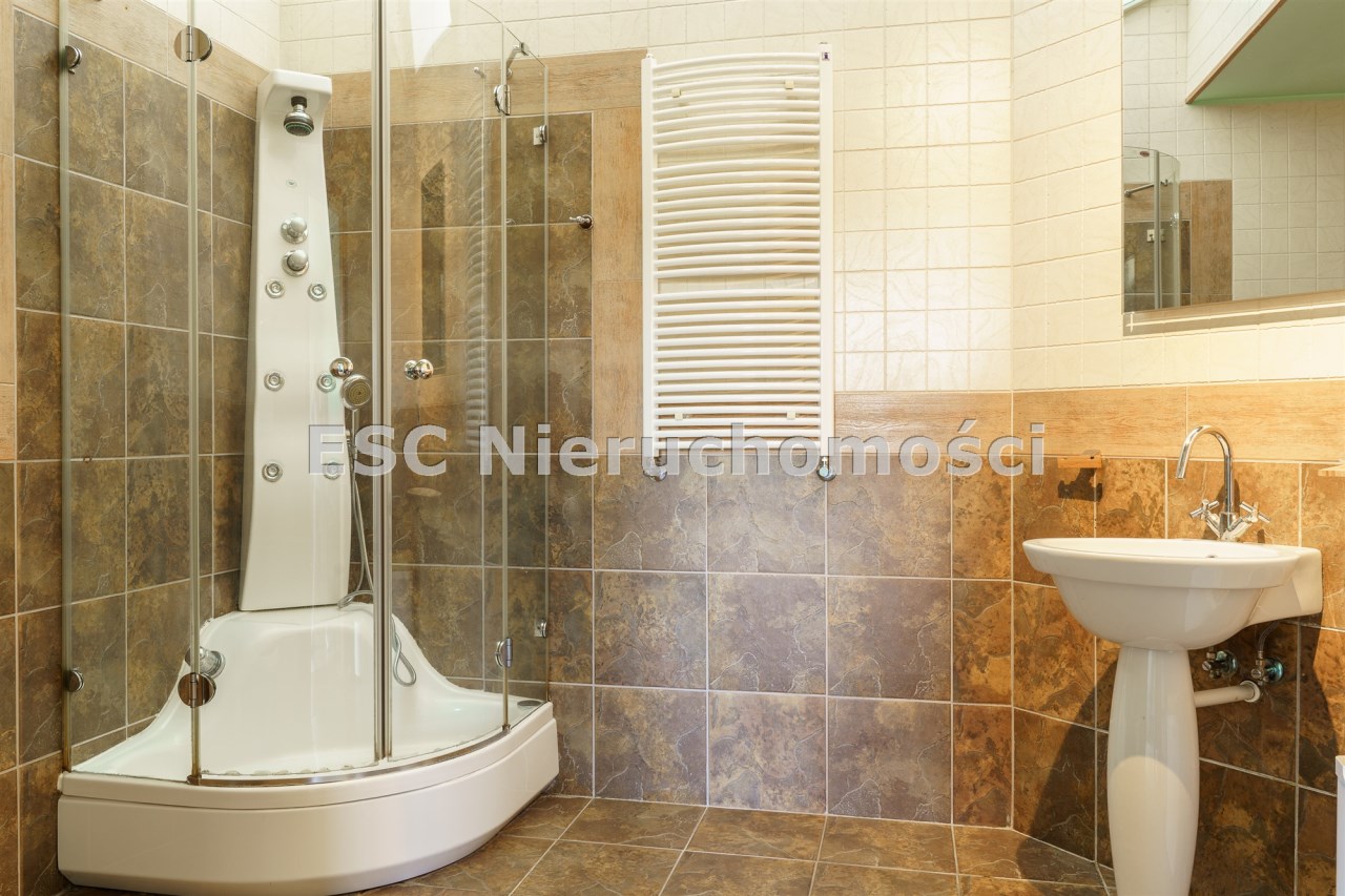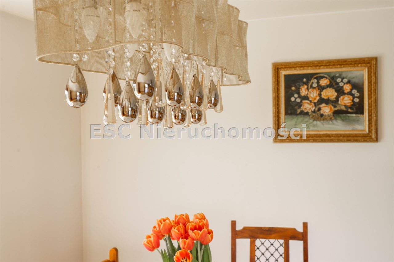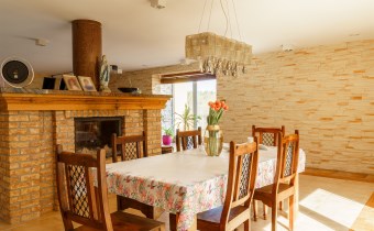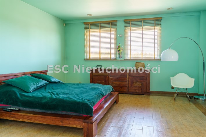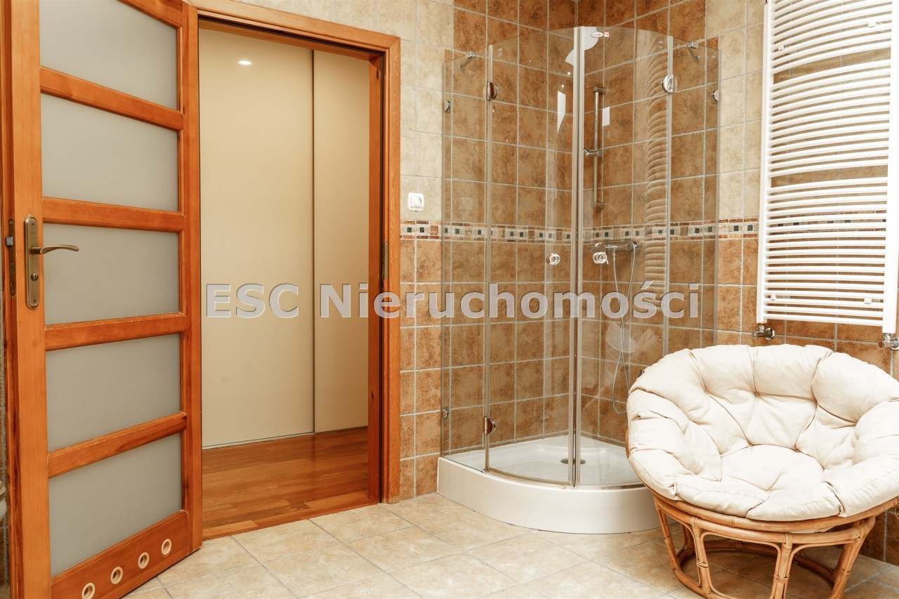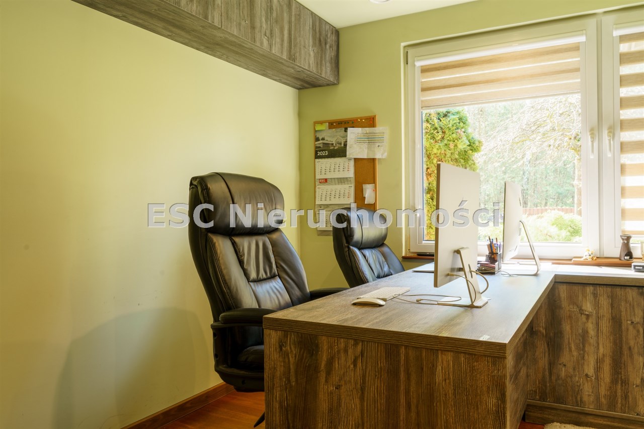 Funkcjonalny układ domu parterowego zapewnia dużą przestrzeń oraz funkcjonalne wykorzystanie całej powierzchni domu. W domu znajduje się bardzo przestronny salon o powierzchni 73 m2, z dwustronnym kominkiem, wyjściem na piękny ogród oraz ogród zimowy o powierzchni 13 m2. Wyjście na ogród zimowy zamykany funkcjonalna roletą bambusową sterowaną na pilota. W salonie znajduje się projektor kinowy z ekranem 3m na 2m, który pozostaje w cenie nieruchomości. Kuchnia bardzo ustawna, jasna i przestronna. W kuchni znajduję się nowoczesna zabudowa kuchenna, która wraz ze sprzętem takim jak: zmywarka, piekarnik elektryczny, płyta indukcyjna, okap, lodówka, ekspres do kawy oraz ciepła szuflada pozostaje w cenie nieruchomości. Wszystkie urządzenia wysokiej klasy firmy Siemens. W kuchnia znajduje się zintegrowany z meblami kuchennymi blat z krzesłami. Dodatkowym atutem na pewno jest spiżarnia, która znajduje się za kuchnią. Na wejściu do domu znajduje się przedpokój o powierzchni ok. 13 m2 zabudowany szafami typu Komandor. Pozostałe pomieszczenia w domu to gabinet o pow. ok. 10 m2, w którym również znajduje się zabudowa mebli wraz z biurkiem do pracy, łazienka o pow. 6 m2, sypialnia o pow.26 m2 z prywatną łazienką o pow. 6,50 m2., 2 pokoje z garderobami o powierzchniach ok. 17 m2 i 20 m2. łazienka przy pokojach o pow. 10m2 z wanną oraz kabiną prysznicową, pomieszczenie gospodarcze o pow. ok. 7,50 m2.W bryle budynku znajduje się podwójny garaż o pow. 57 m2. W korytarzu, który prowadzi do części sypialnianej znajduje się bardzo efektowna ściana z piaskowca ze ściennym wodospadem, który latem powoduje znakomity mikroklimat.