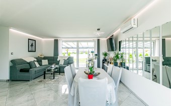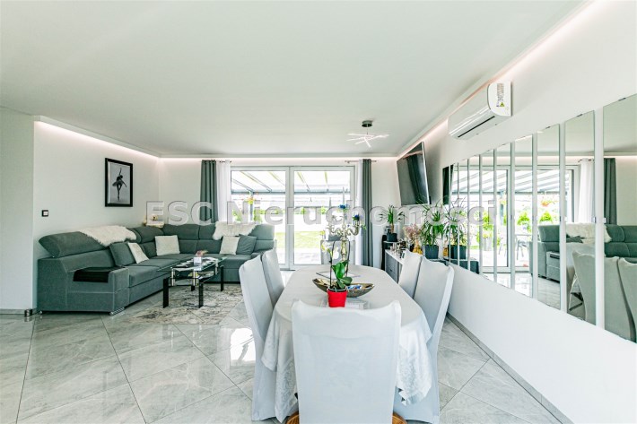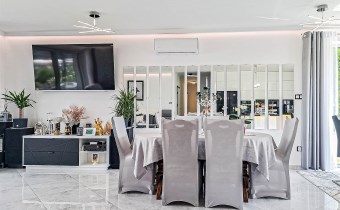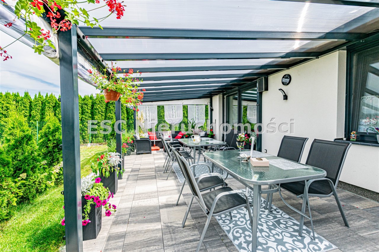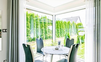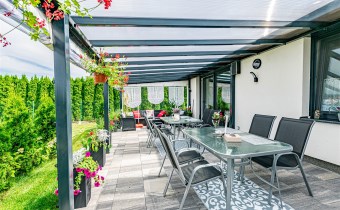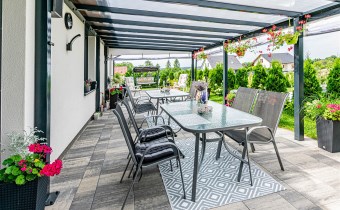 Taras o pow. 60m2 w większej części zadaszony (45 m2) poliwęglanem, oraz z opuszczanymi ścianami, który w zależności od potrzeb i warunków atmosferycznych tworzy idealne miejsce do relaksu i spędzania czasu na świeżym powietrzu przez cały rok.
