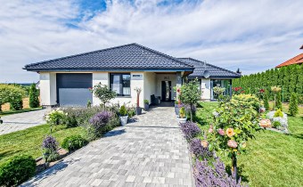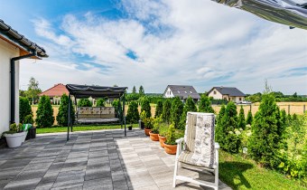Taras wyłożony płytką tarasową, natomiast podjazd oraz komunikacja na posesji wyłożona kostką brukową.