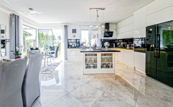 W części użytkowej domu: salon, kuchnia, pokoje oraz przedpokój i łazienka na podłodze kafle z powłoką szklaną odporną na zarysowania.