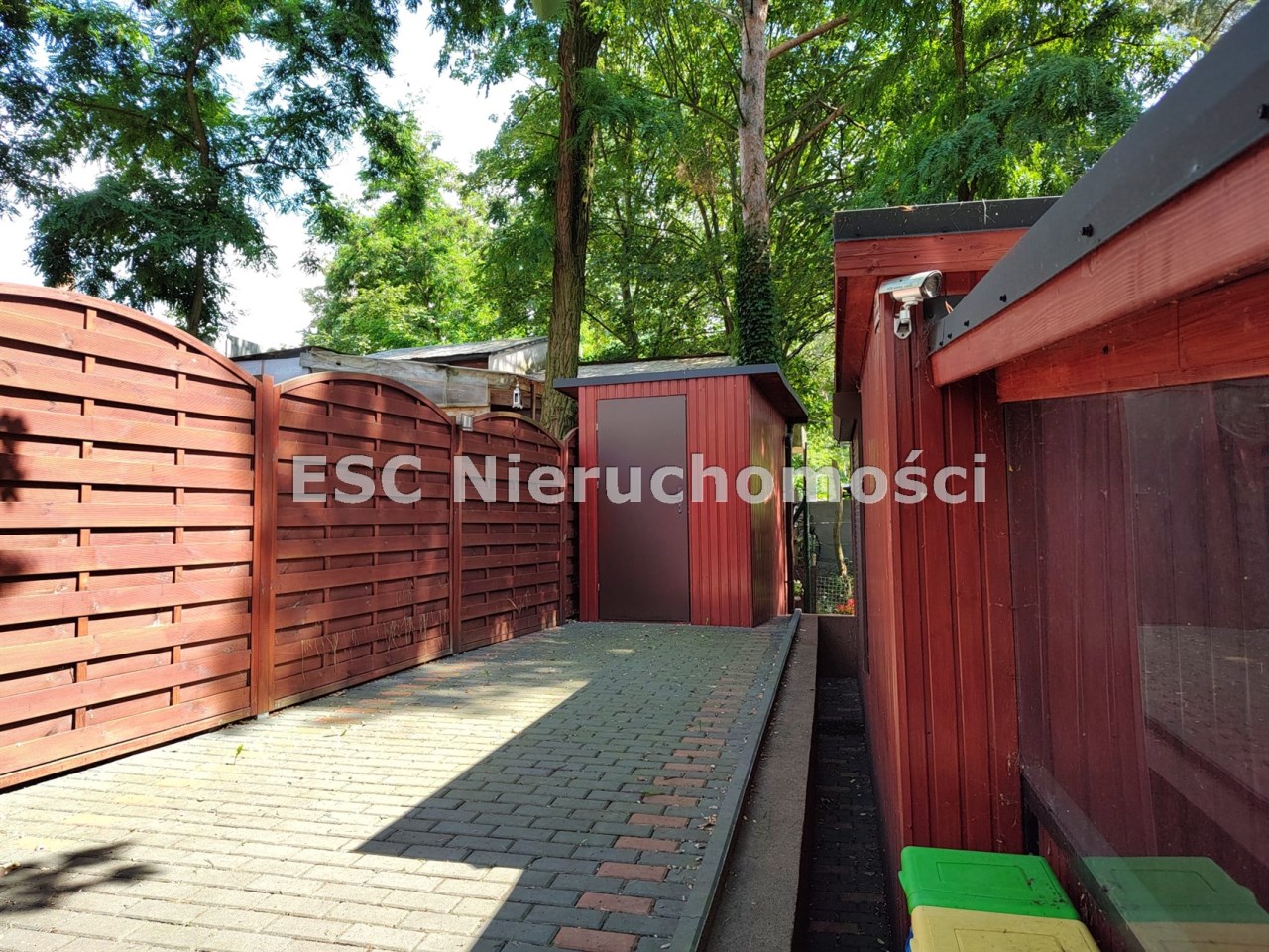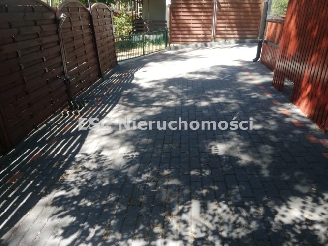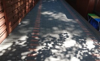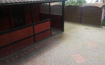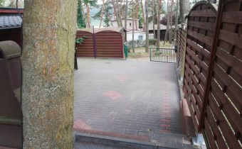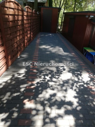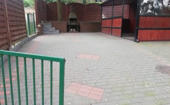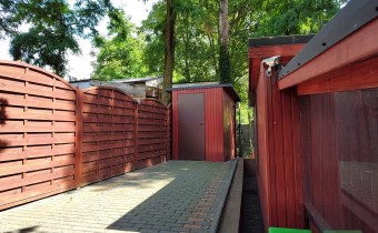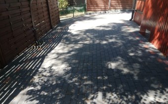 Teren ogrodzony, wyłożony kostką brukową. Na działce znajduje się drewniana szopa