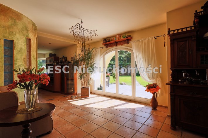 ponad 3.metrowe okno w kształcie półokręgu z widokiem na ogród), kuchnia o pow. 13 m2 z przyległą spiżarnią o pow. 2,99 m2,
