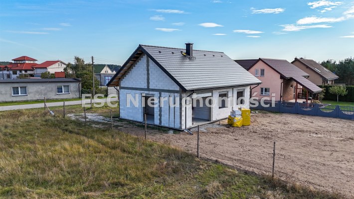 Budynek mieszkalny jednorodzinny parterowy z dachem dwuspadowym pokrytym dachówką betonową płaską. Wybudowany w technologi tradycyjnej z bloczków betonowych YTONG.