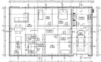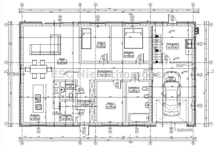 Wyprowadzono instalacje na zewnątrz budynku zgodnie z założeniem ewentualnej budowy ogrodu zimowego. Garaż z kanałem, który służy również jako zsyp na paliwo stałe - z bramą na pilota.