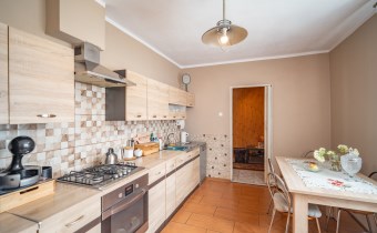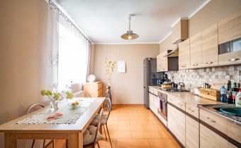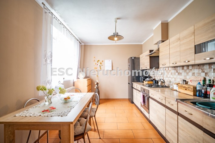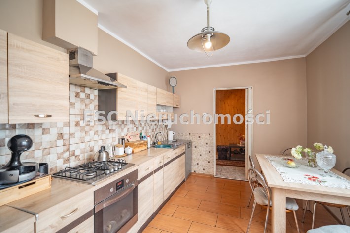 Stolarka okienna PCV, na podłodze panele oraz terokota. Zabudowa kuchenna ze sprzętem AGD w cenie