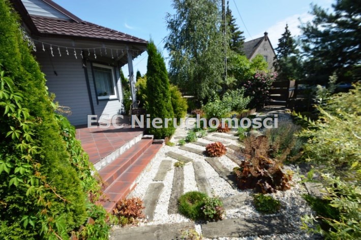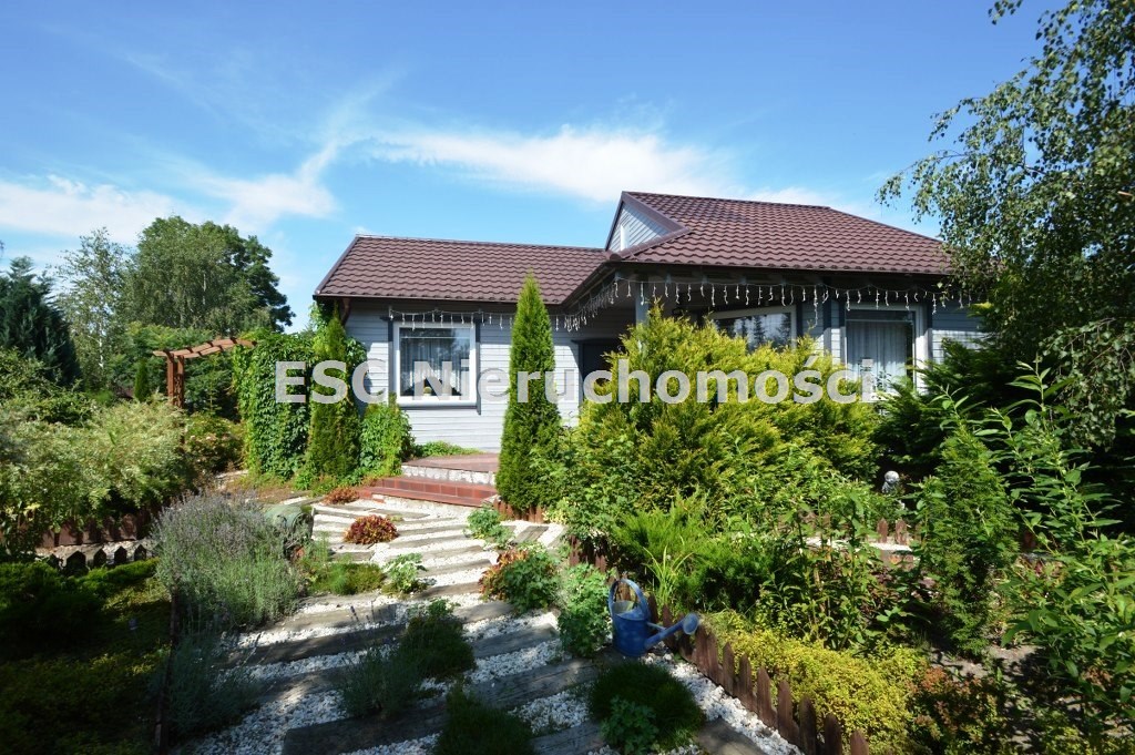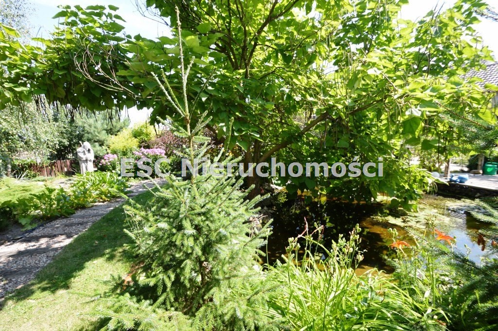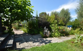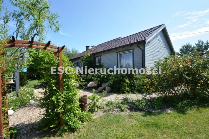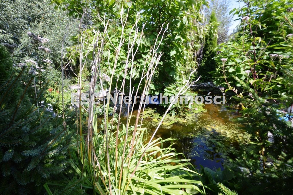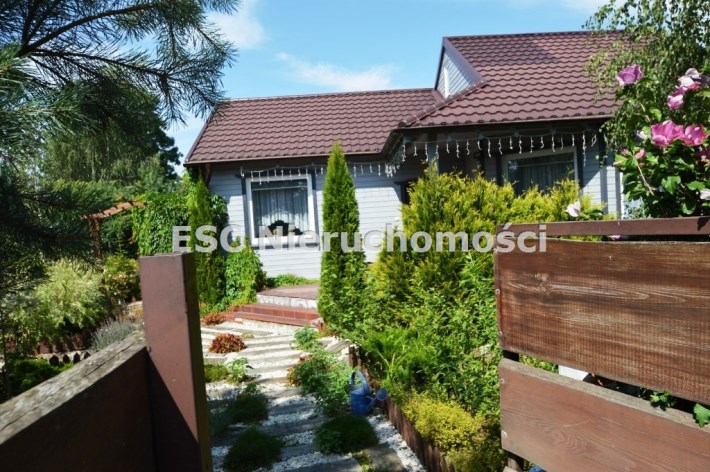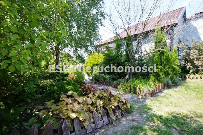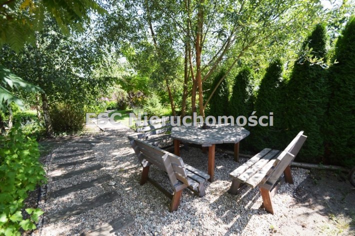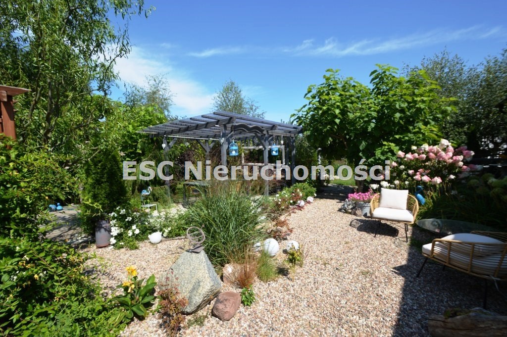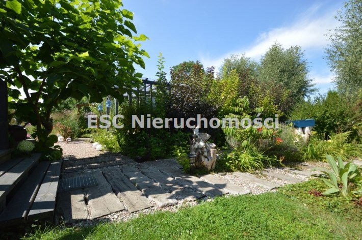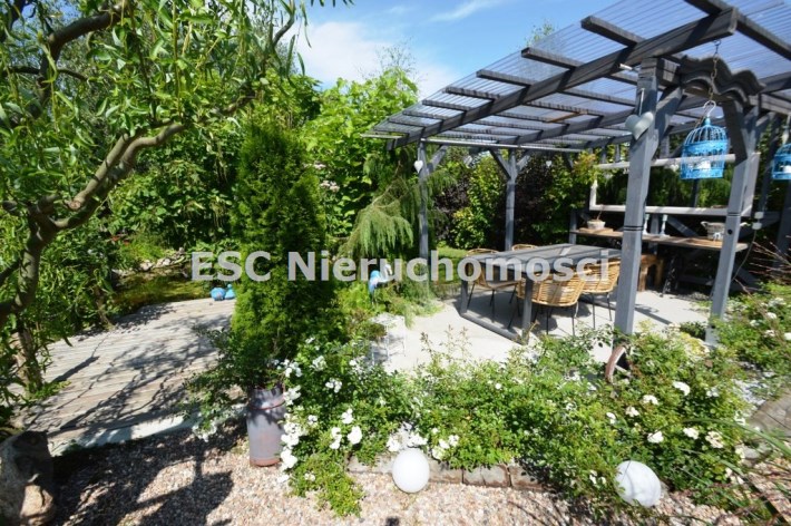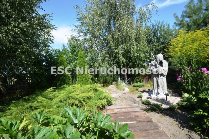 Ogród został starannie zaprojektowany i obsadzony różnorodnymi roślinami, które kwitną przez cały sezon, dodając koloru i zapachu oraz zapewniając cień. Centralnym punktem jest urokliwe oczko wodne, które okalają dwie duże Katalpy. przy oczku wodnym znajduje się podest umożliwiający podejście bezpośrednio do oczka wodnego oraz zadaszone miejsce ze stołem i krzesłami. Na tylniej części ogrodu znajdziemy garaż blaszany na urządzenia ogrodnicze oraz kolejne miejsce na odpoczynek ze stołem i ławkami drewnianymi oraz warzywnik. W ogrodzie pomiędzy roslinnoscią zadbano o ścieżki, które sa oświetlane lampami solarnymi. Kolejnym miejscem na odpocynej będzie również drewniany taras, na który można wyjśc bezpośrednio z kuchni.