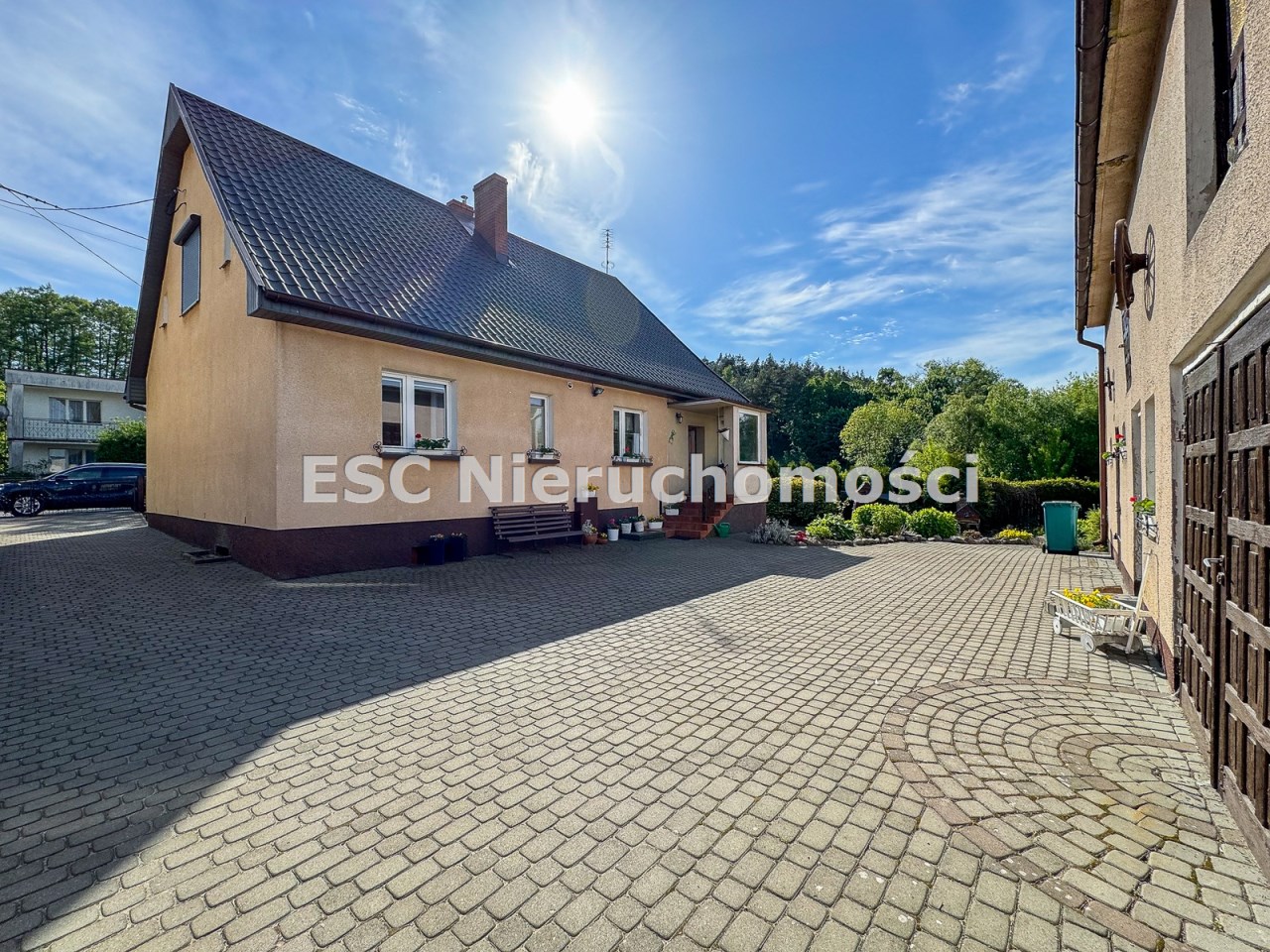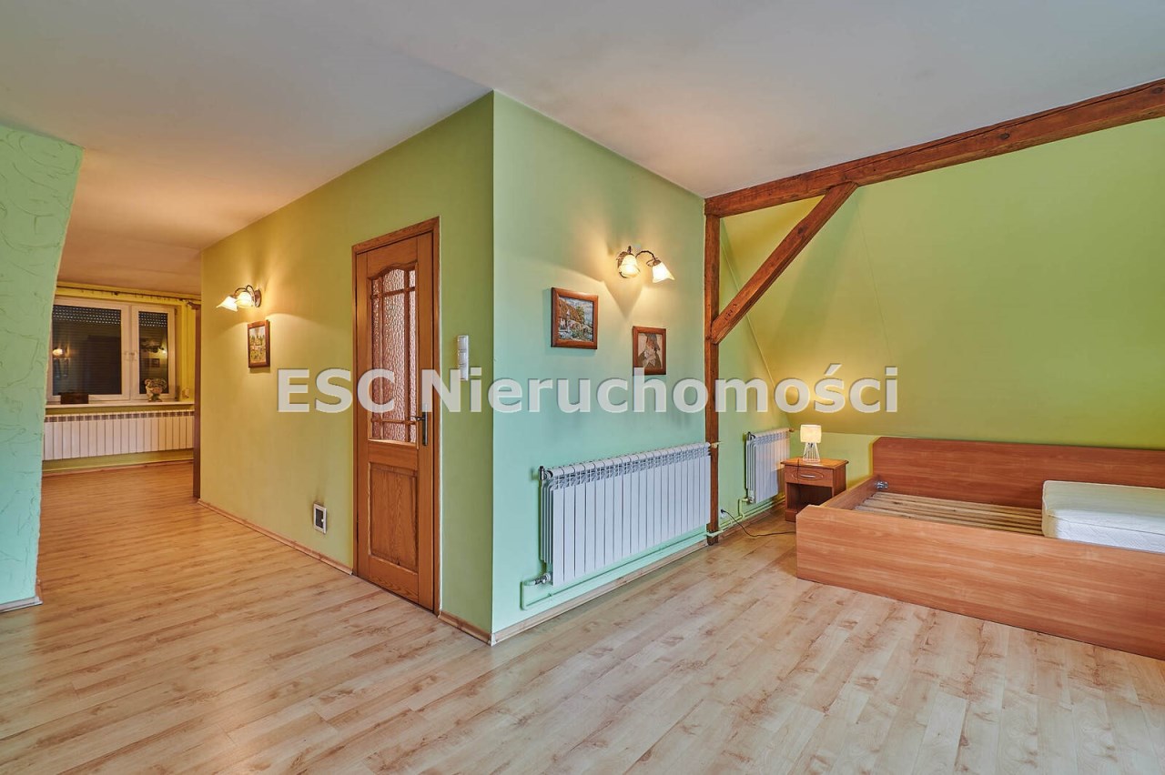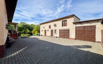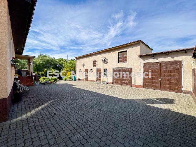 Na terenie posesji znajduje się przestronny budynek gospodarczy, który obejmuje garaż na dwa samochody z kanałem, kuchnię letnią oraz dodatkowe pomieszczenie gospodarcze. Istnieje również potencjał adaptacyjny na piętrze budynku, który można dostosować do własnych potrzeb.