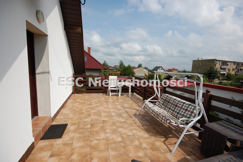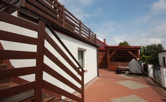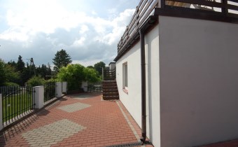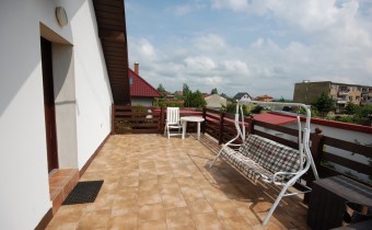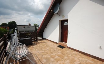 Taras ok 22m2, podłoga terakota, balustrada drewniana, wejście do części mieszkalnej na poddaszu poprzez taras.