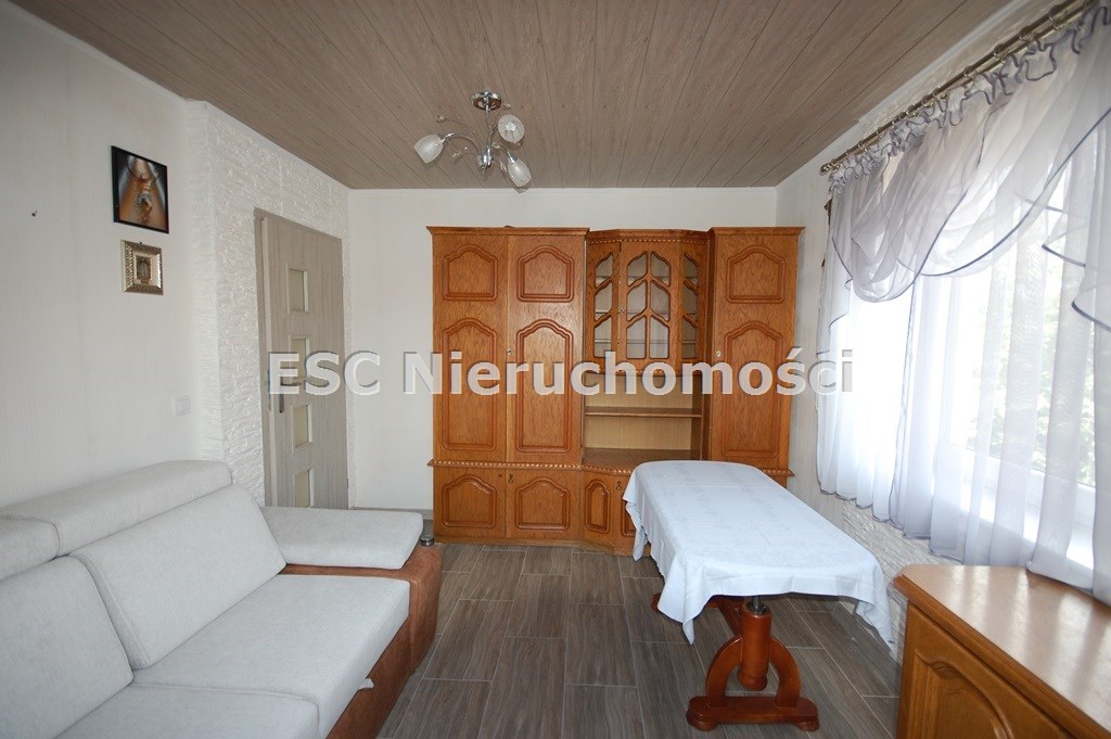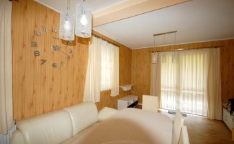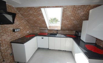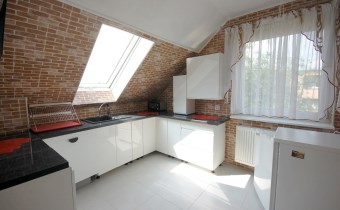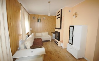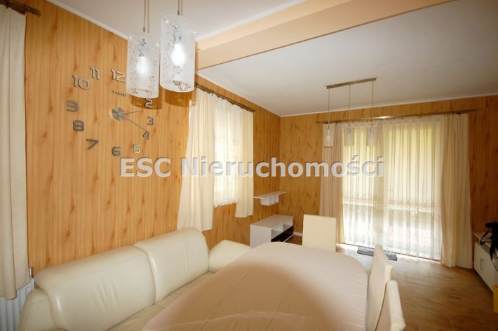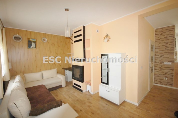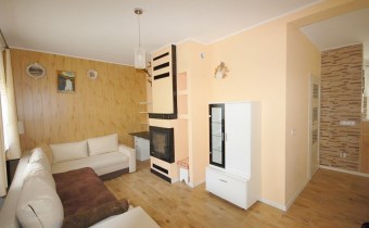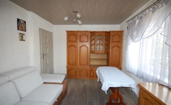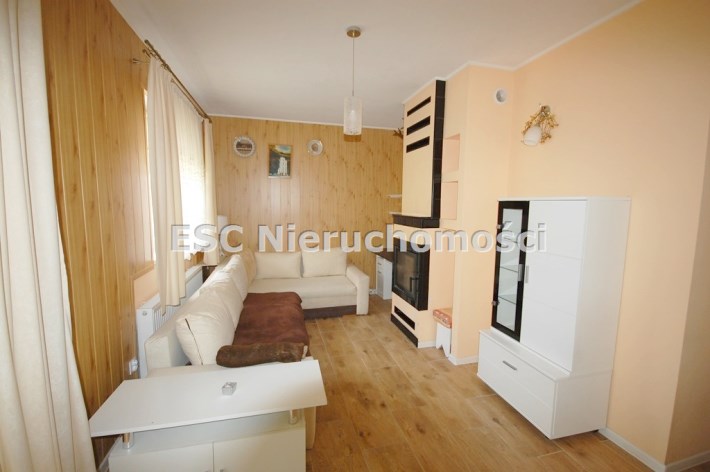 - salon z aneksem kuchennym pow.ok 34,05 m2, podłoga pokryta terakotą, ściany gipsowane-malowane, w części pokryte panelami ściennymi, salon wyposażony w czynny kominek z wyprowadzeniami przewodów ciepła na część poddaszową, w części kuchennej ściany pokryte glazurą, tradycyjna zabudowa kuchenna z kuchenką gazową Beko i pochłaniaczem Ciarko w cenie.