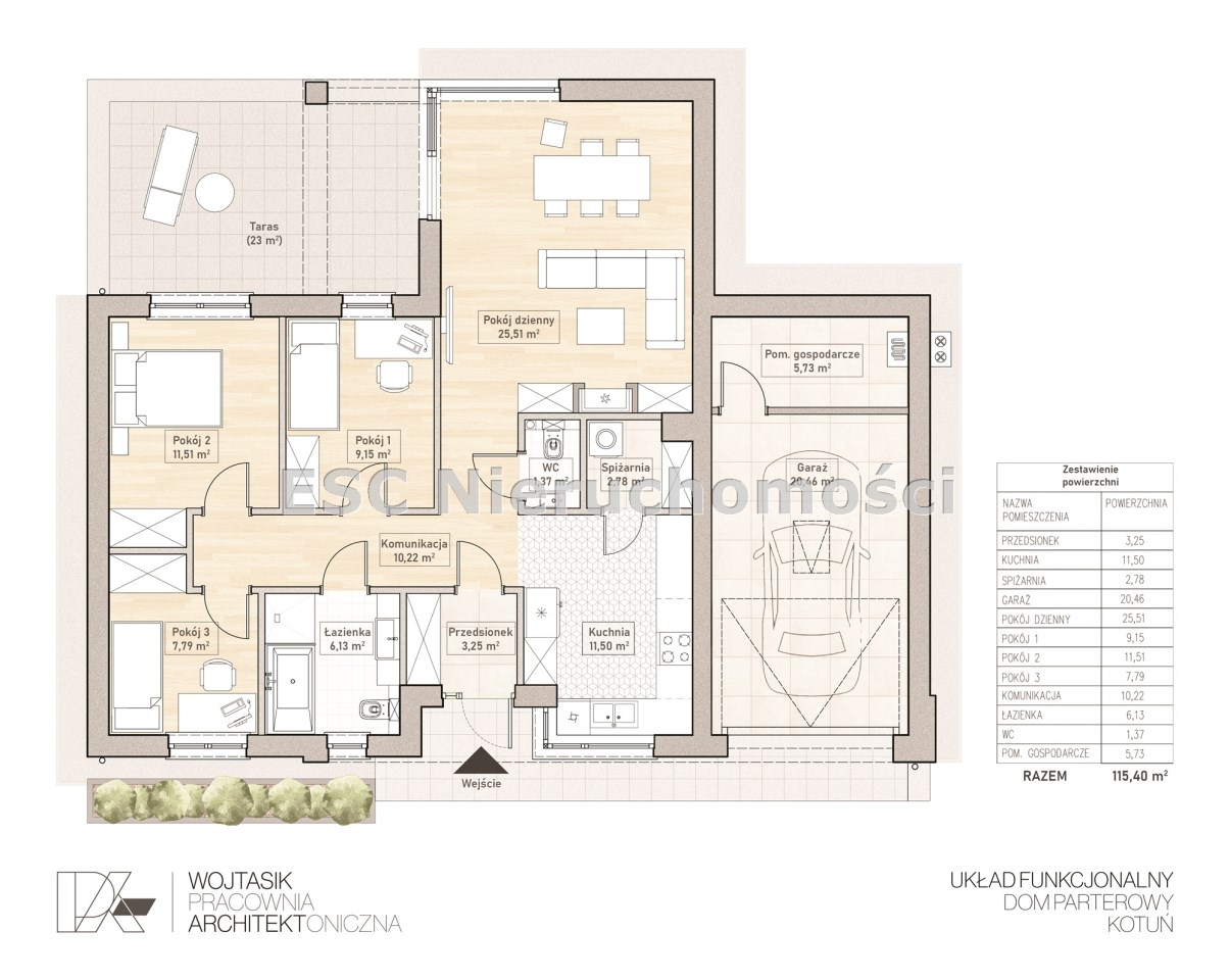 Funkcjonalny układ pomieszczeń zapewnia efektywne wykorzystanie całej przestrzeni domu: pokój dzienny o pow. 25,51 m2  z wyjściem na taras, oddzielna kuchnia o pow. 11,50 m2 ze spiżarnią o pow. 2,78 m2, trzy pokoje o pow.: 11,51m2 ,9,15m2 ,7,79m2, łazienka o pow. 6,13 m 2, wc o pow. 1,37 m2, komunikacja o pow. 10,22 m2, przedsionek o pow. 3,25 m2 oraz garaż o pow. 20,46 m2 z pomieszczeniem gospodarczym o pow. 5,73 m2.