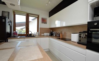- Salon z aneksem kuchennym - przestronny z wyjściem na taras, wyposażony w zabudowę mebli kuchennych wraz ze sprzętem AGD (zmywarka, płyta indukcyjna, piekarnik elektryczny, pochłaniacz pary i zapachów) które pozostają w cenie.