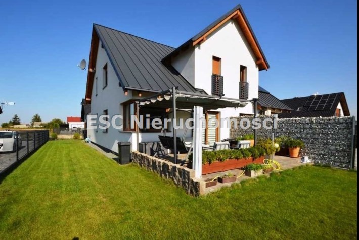 - Typ budynku: dom parterowy z poddaszem użytkowym w zabudowie bliźniaczej, teren całkowicie ogrodzony z bramą wjazdową.