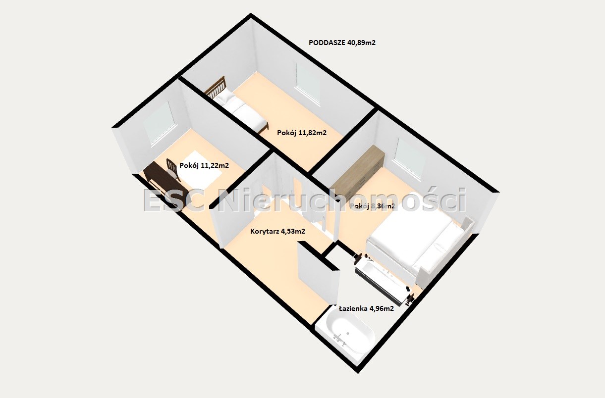 - 3 sypialnie - znajdujące się na poddaszu, w dwóch sypialniach pozostają szafy w zabudowie