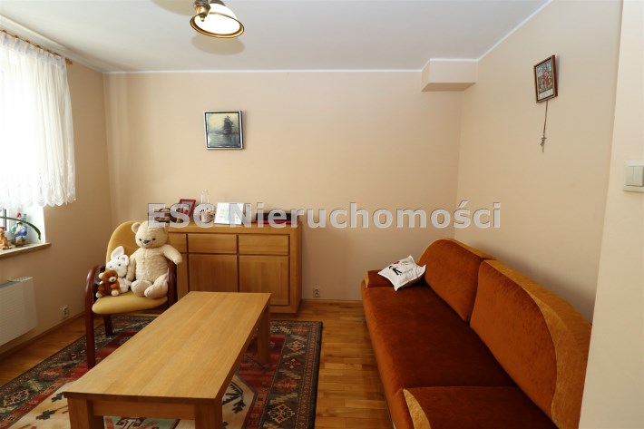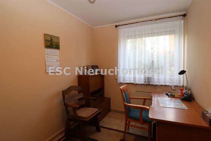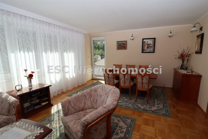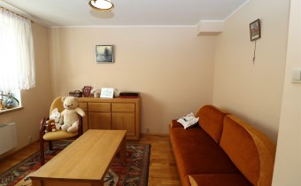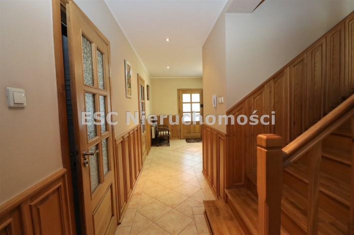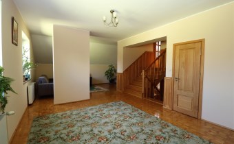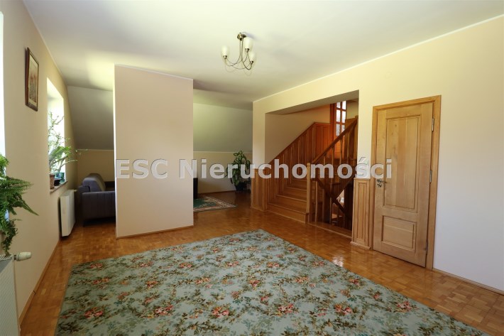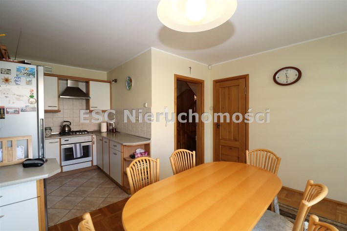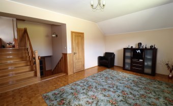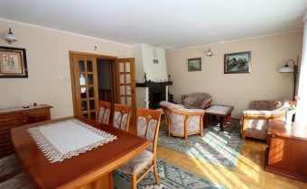 Półpiętro: salon z kominkiem (kominek posiada rozprowadzenia do pokoju na piętrze) i wyjściem na piękny, klimatyczny ogród. Kuchnia bardzo ustawna, duża, w którym zmieści się swobodnie duży stół. Dodatkowym atutem jest spiżarnia przy kuchni.