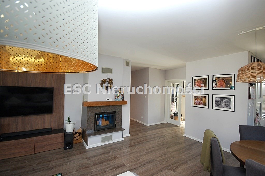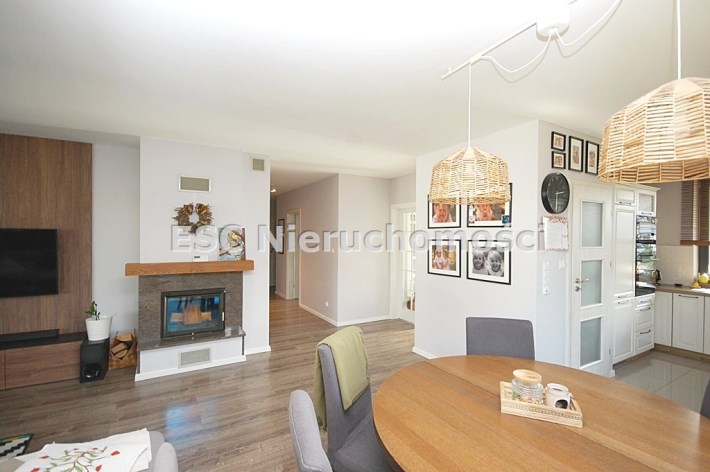 Salon podłoga w panelach,ściany gipsowane-malowane,wyposażony w kominek z płaszczem wodnym,świetnie doświetlony oknem balkonowym oraz tarasowym