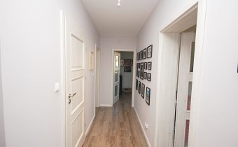 3.Komunikacja/sień+holl+korytarz/-5,85m2+12,68m2 sień-podłoga gres,zabudowa szafa pozostająca w cenie,pozostała część podłoga panele,ściany gipsowane-malowane.