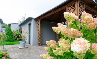 Na tyłach domu podwórko, przestronny garaż oraz pomieszczenia gospodarcze.