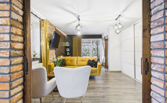W aranżacji domu wykorzystano m.in. 120-letnią cegłę, nadającą przestrzeni niepowtarzalnego stylu i ciepła. Całość dopełniają piękne detale, takie jak drewniane drzwi przesuwne prowadzące do kuchni i łazienki – rozwiązanie zarówno efektowne, jak i praktyczne.
