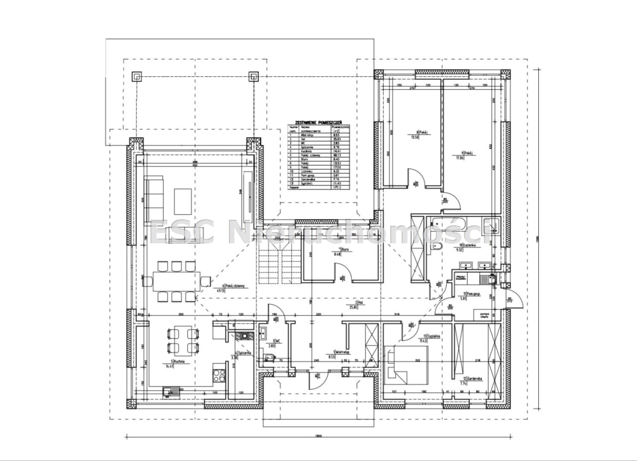salon (49,13m2); kuchnia (14,41m2); spiżarnia (3,78m2); pokój (17,06m2), pokój (13,50m2), pokój (11,43m2) z garderobą (7,74m2), biuro/pokój (8,40m2), łazienka (9,32m2), wc (2,83m2), pom. gospodarcze (5,01m2), wiatrołap (8,53m2)