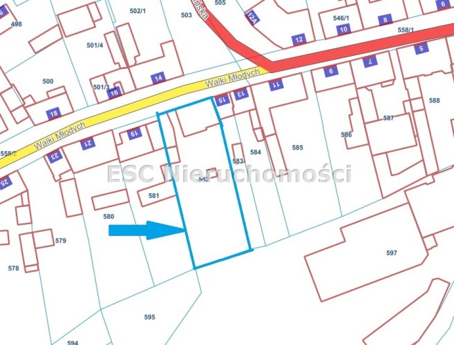 Działka niezabudowana, położona bezpośrednio przy ul. Walki Młodych, dojazd asfaltowy, chodnik przy granicy działki.