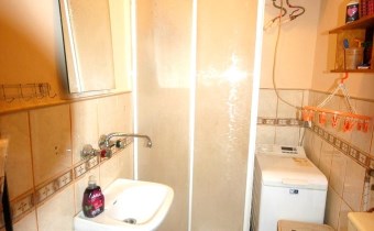 ok. 3,75m2 – na ścianach glazura do 1/2 wysokości , na podłodze kafle, razem z WC, kabina natryskowa, grzejnik drabinkowy ciepła woda z bojlera elektrycznego.