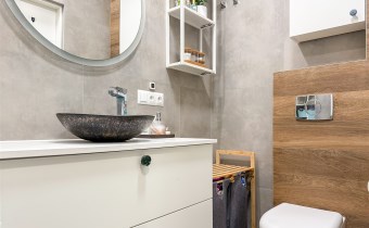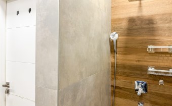 - Łazienka 3,80 m² – wnęka prysznicowa, nowoczesny posadzkowy brodzik, płytki, które nie boją się spojrzeń