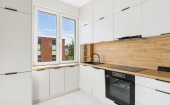 Kuchnia o powierzchni 7,9 m2 wyposażona w nowe meble robione na wymiar - w kolorze kaszmir oraz nowy sprzęt AGD (lodówka, zmywarka, piekarnik, płyta indukcyjna). Kuchnia wyposażona w duże okno, przez co jest bardzo jasna.