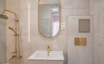 Łazienka o powierzchni 3,2 m2, elegancka, wykończona w jasnych płytkach ze złotym wykończeniem, wyposażona w wannę z prysznicem, umywalkę z szafką, oraz WC w zabudowie;