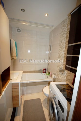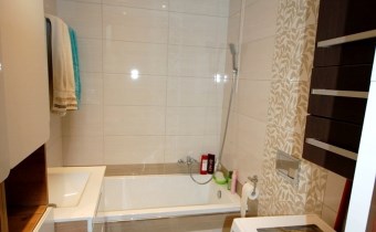 - łazienka o pow. ok 3,50 m2 całość ścian pokryta nowoczesną glazurą, podłoga w terakocie, wanna, szafki łazienkowe wiszące i stojące /zawarte w cenie/