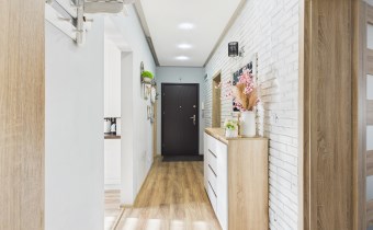 W mieszkaniu zastosowano spójną, jednolitą stolarkę drzwiową oraz estetyczne panele podłogowe tworzące harmonijną całość.