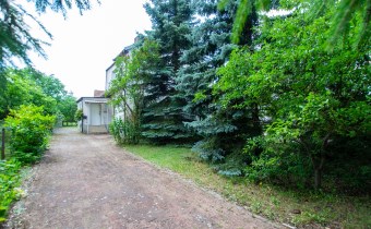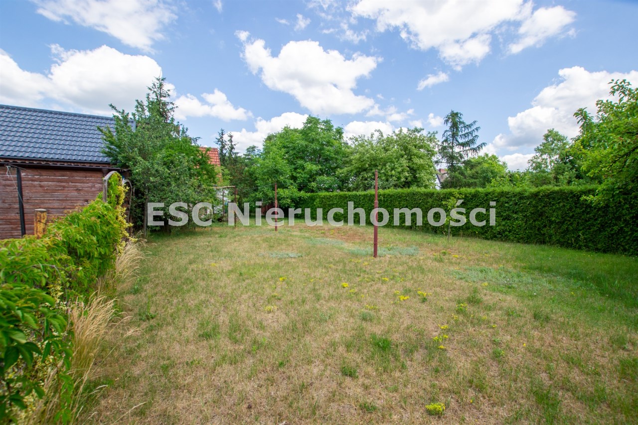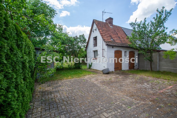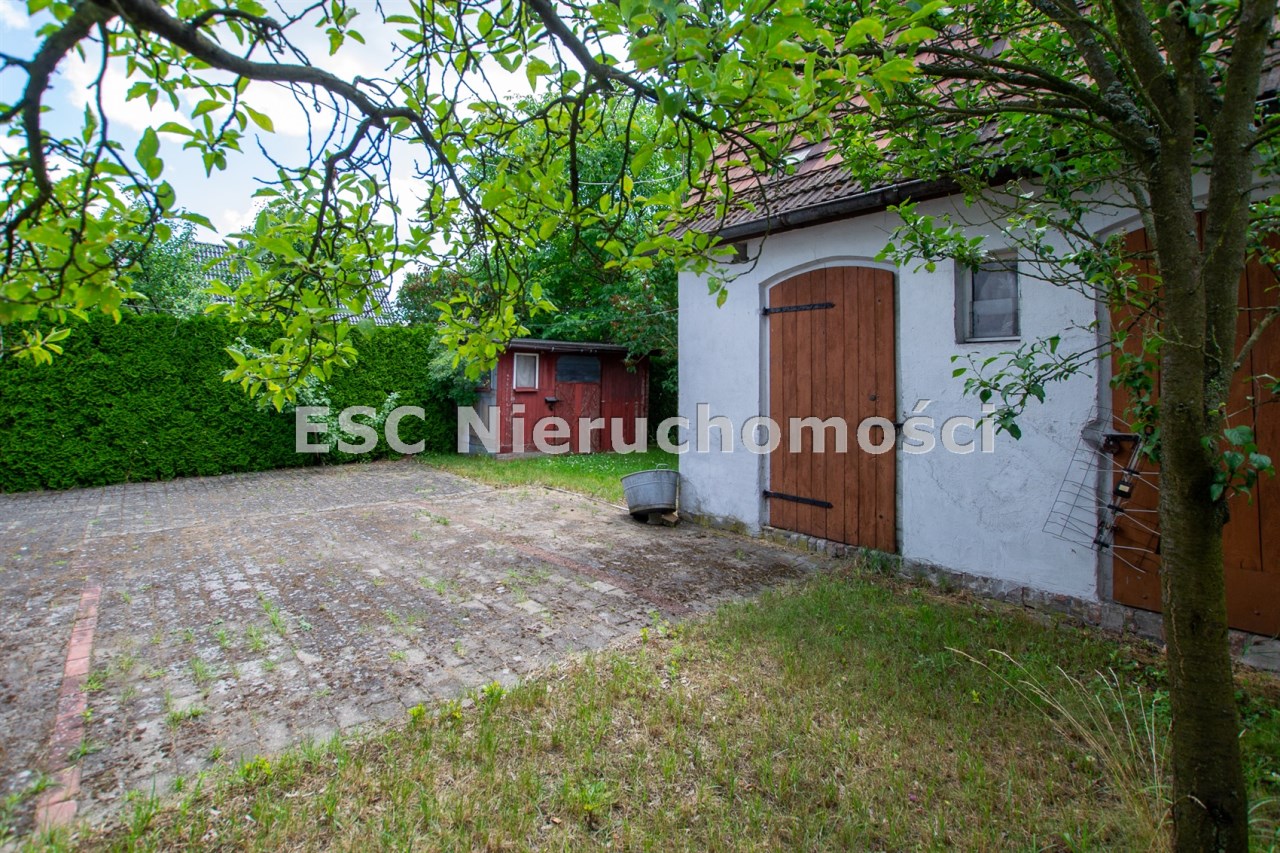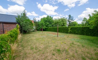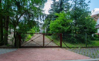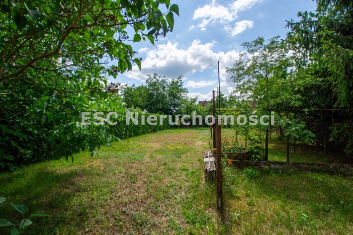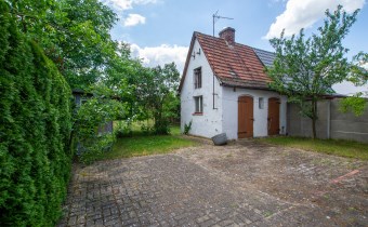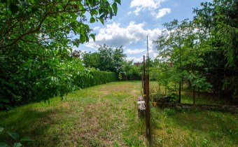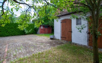 Jest również murowane pomieszczenie gospodarcze a za nim część działki z drzewami i krzewami.