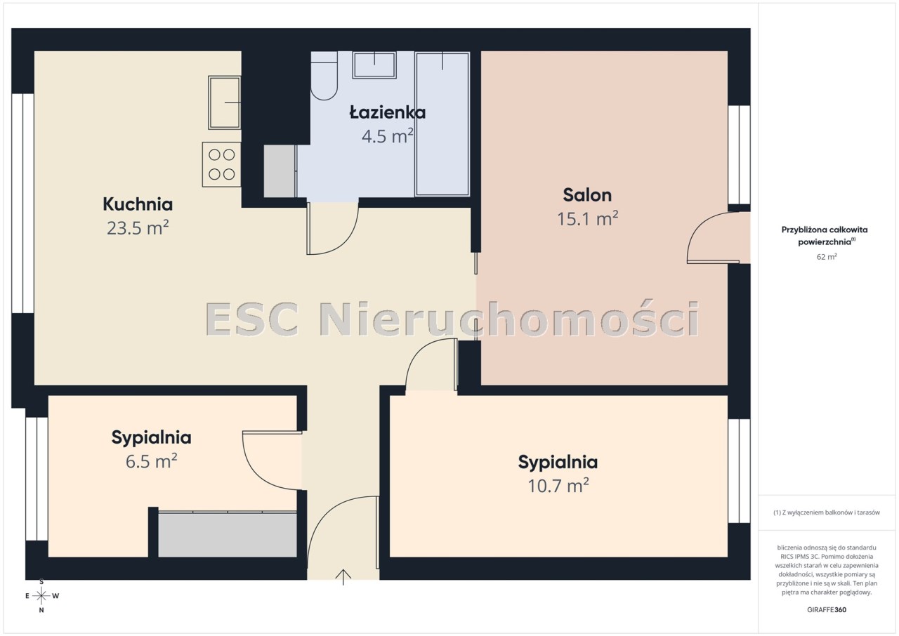Powierzchnia mieszkania 63,56 m 2 . salon o pow. 16,1 m2 z wyjściem na duży balkon i klimatyzacją,