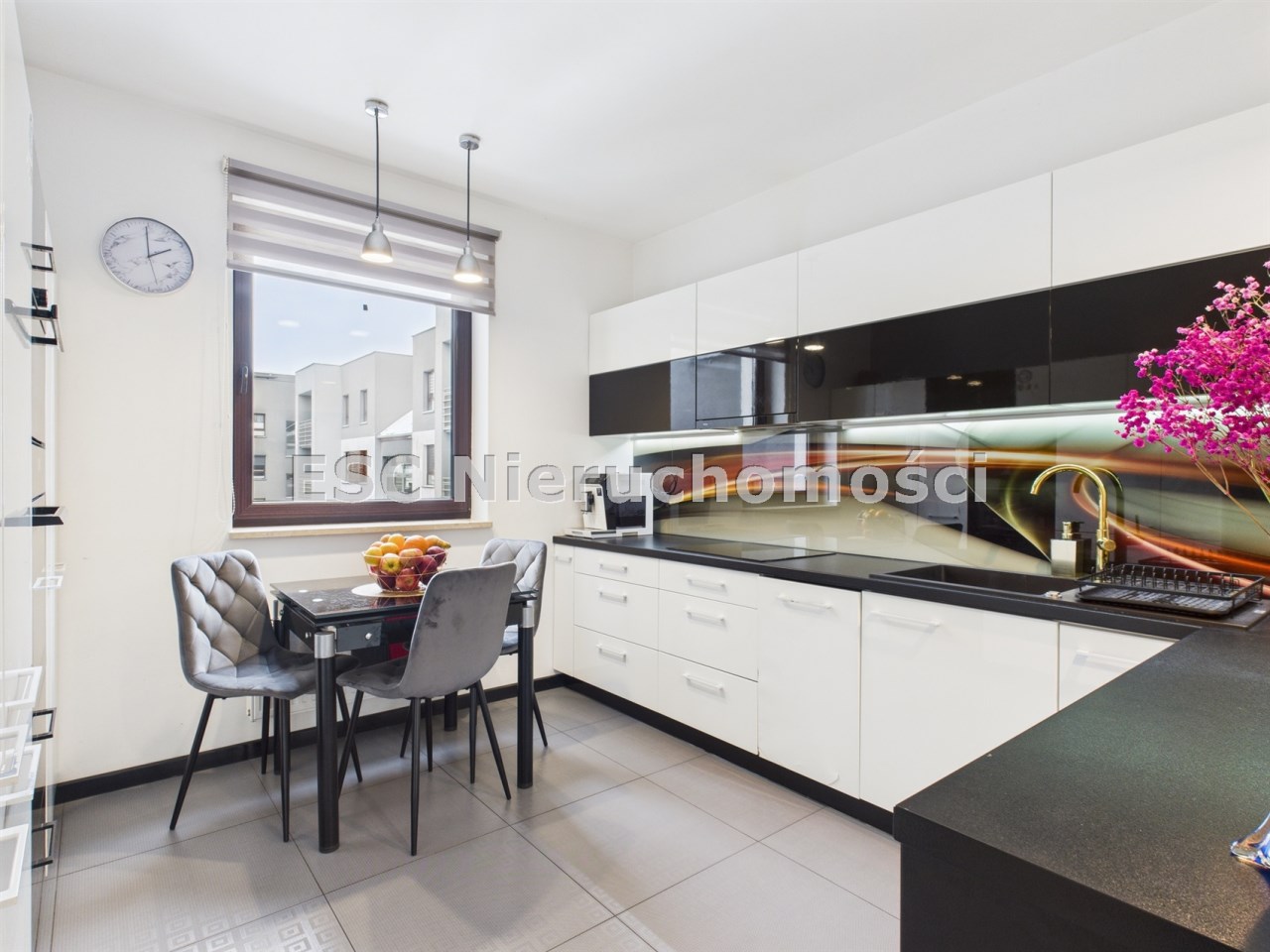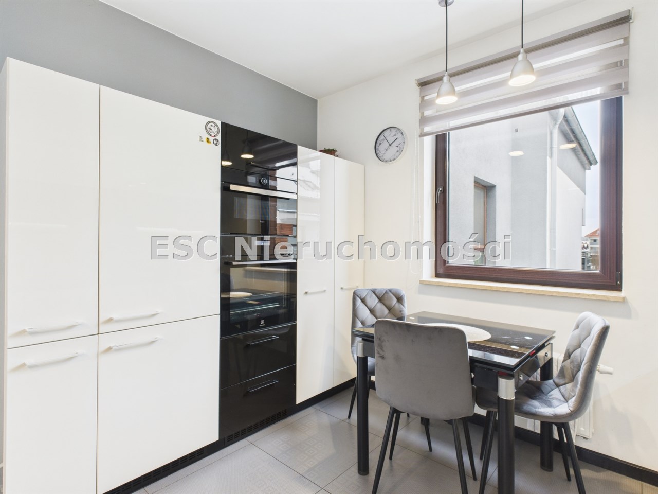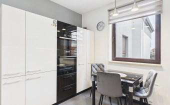 płyta indukcyjna, okap, piekarnik, mikrofala, zmywarka oraz lodówka. Stół i 3 krzesła tworzą wygodną przestrzeń do codziennych posiłków.