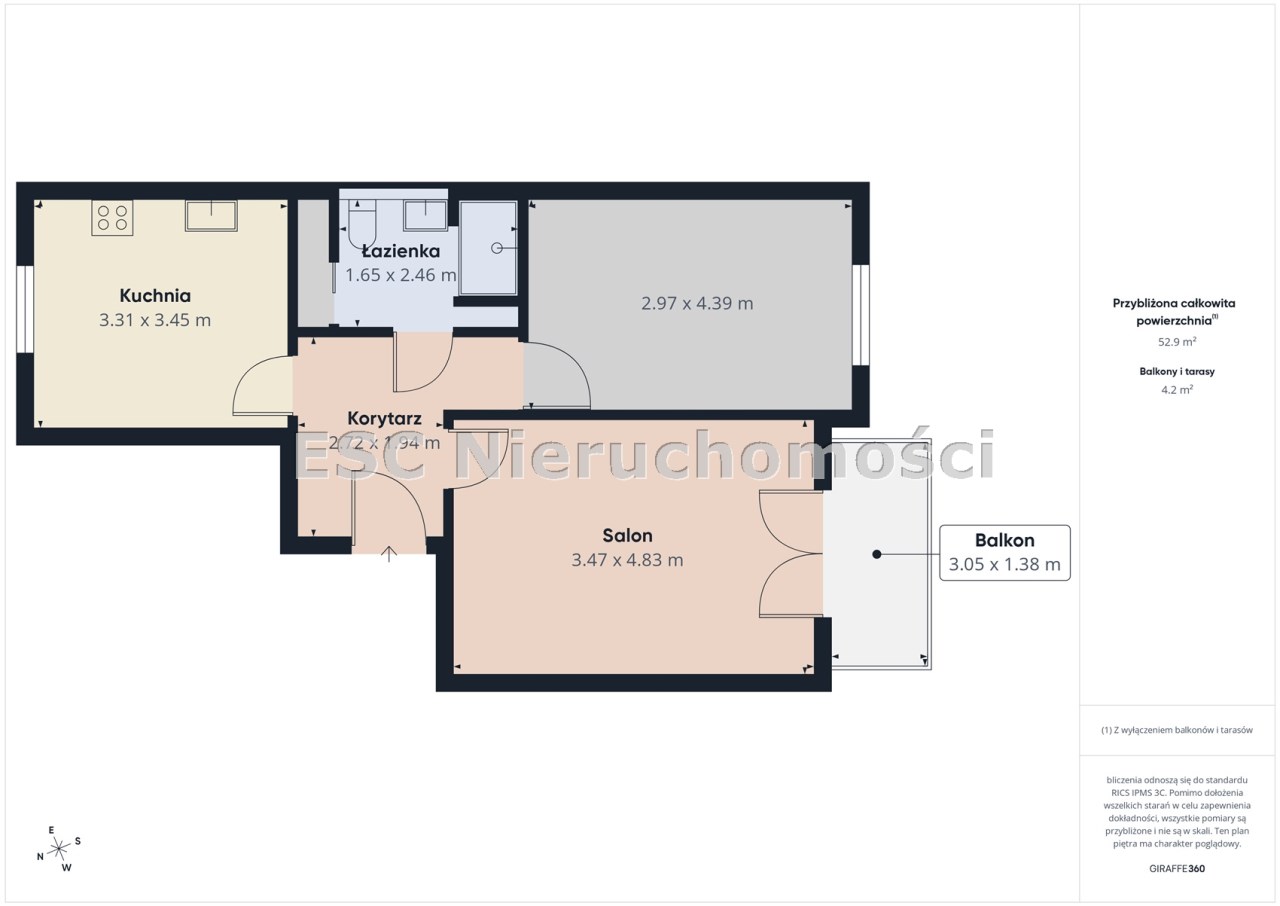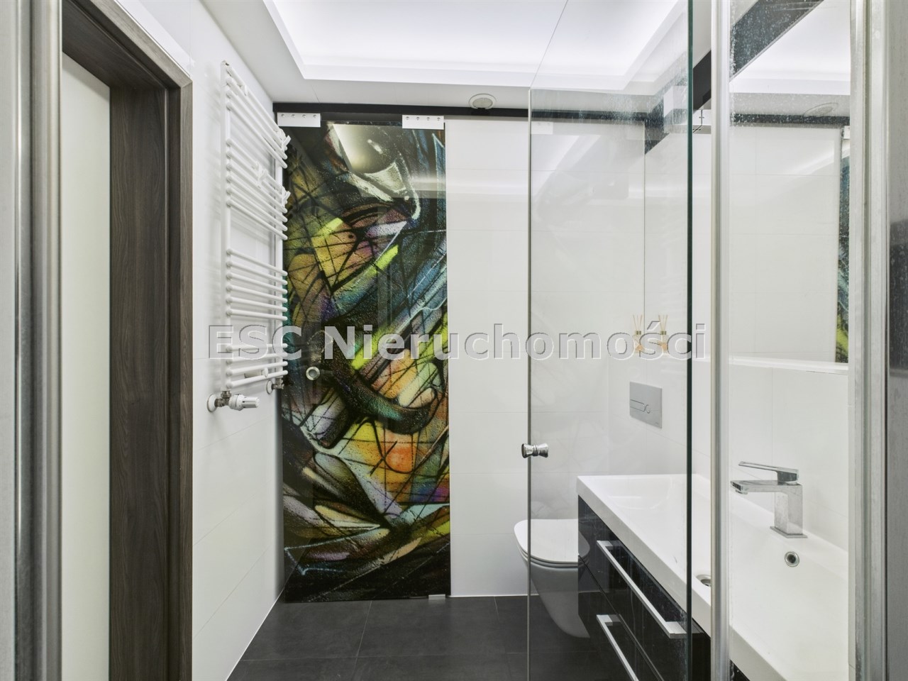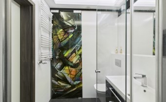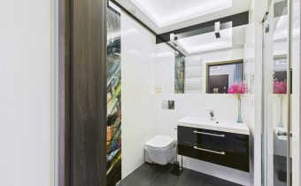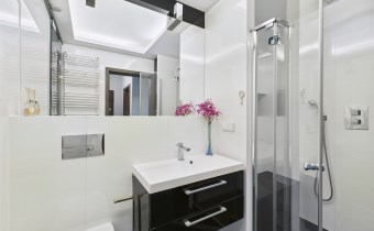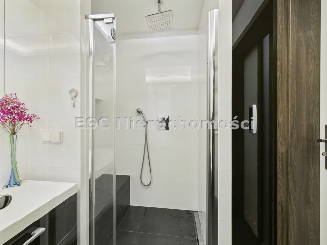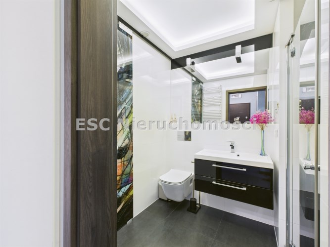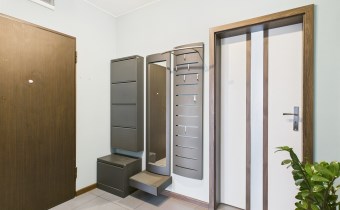 - łazienka (4,3 m²) z elegancką zabudową i miejscem do przechowywania