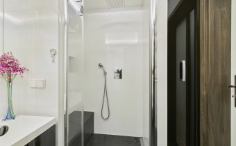 Łazienka wyposażona w duży prysznic z ławeczką i odpływem liniowym. Pralka ukryta w estetycznej zabudowie z przestrzenią do przechowywania. Sufit podwieszany.