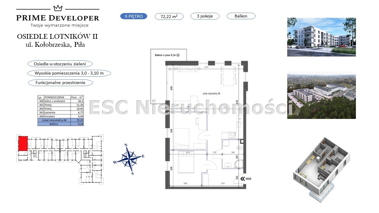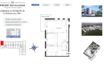 Mieszkanie 3-pokojowe z balkonem o pow. 72,22m2, II piętro o następującym układzie pomieszczeń: