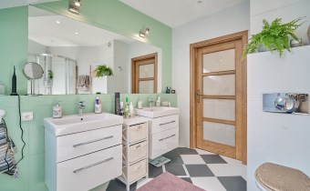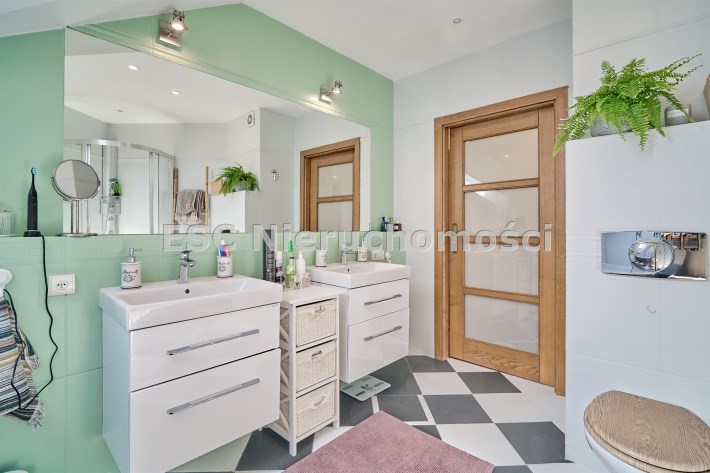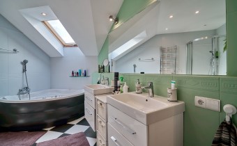 narożna wanna z hydromasażem, prysznic, 2 umywalki, toaleta typu Geberit.