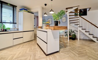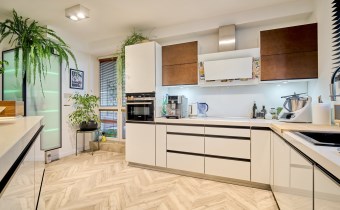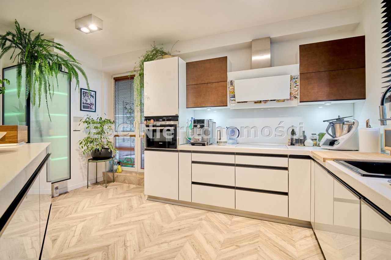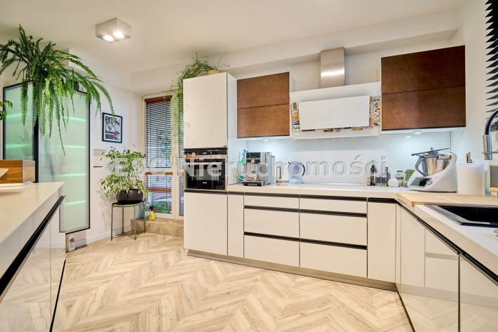 Meble w zabudowie z dużą ilością szuflad (systemy BLUM, szafki cargo), AGD renomowanych marek: lodówka w zabudowie, zmywarka Siemens, piekarnik z funkcją mikrofali Siemens, płyta grzewcza Bosch, okap Bosch.