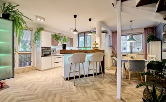 Przestronny salon z jadalnią oraz kuchnią to łącznie ponad 57 m2.