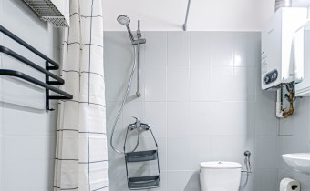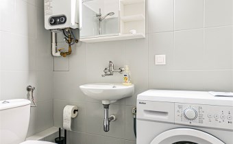 - W łazience - pralka, brodzik prysznicowy, umywalka, szafka z lustrem, grzejnik typu drabinka i Junkers